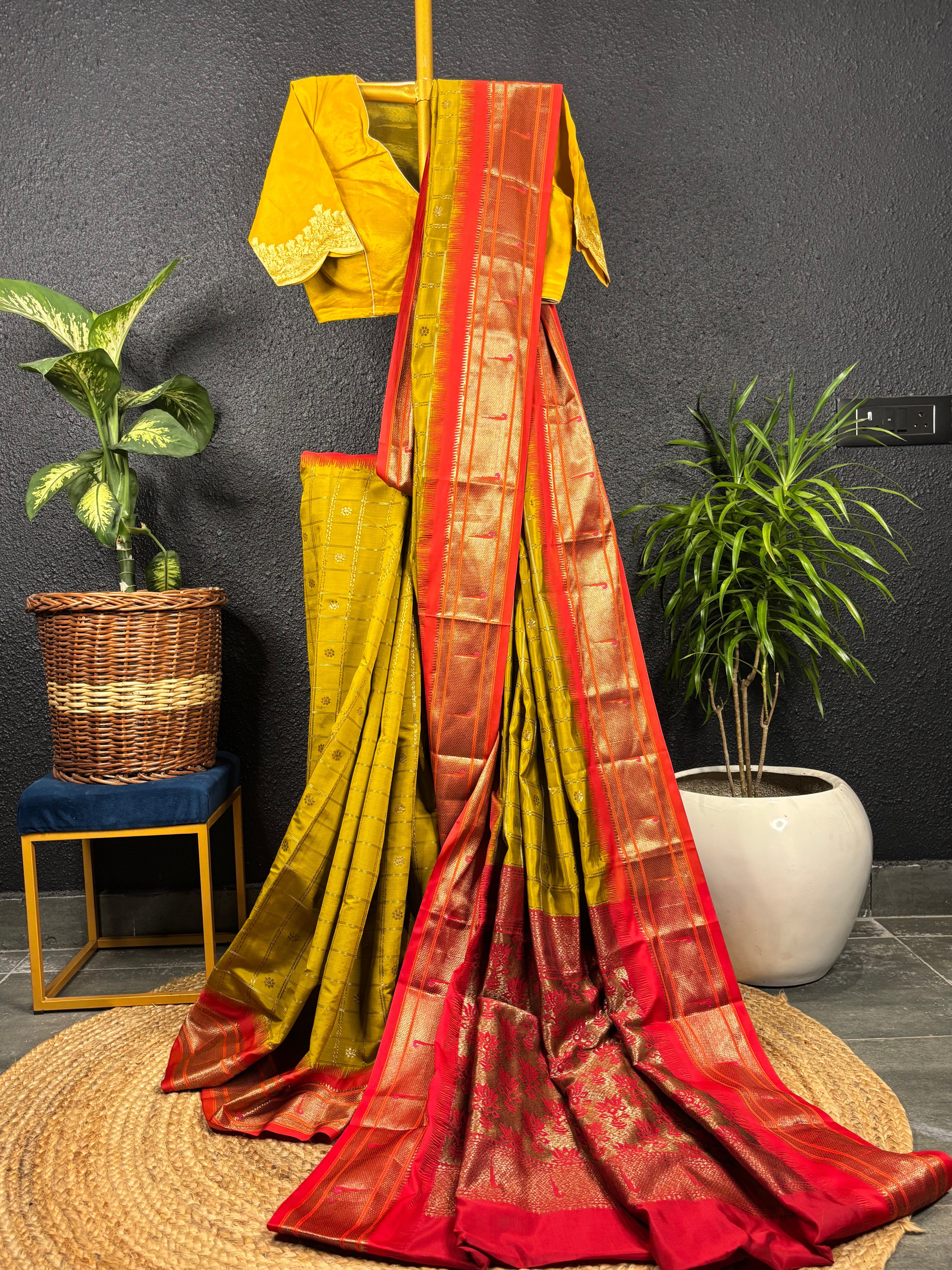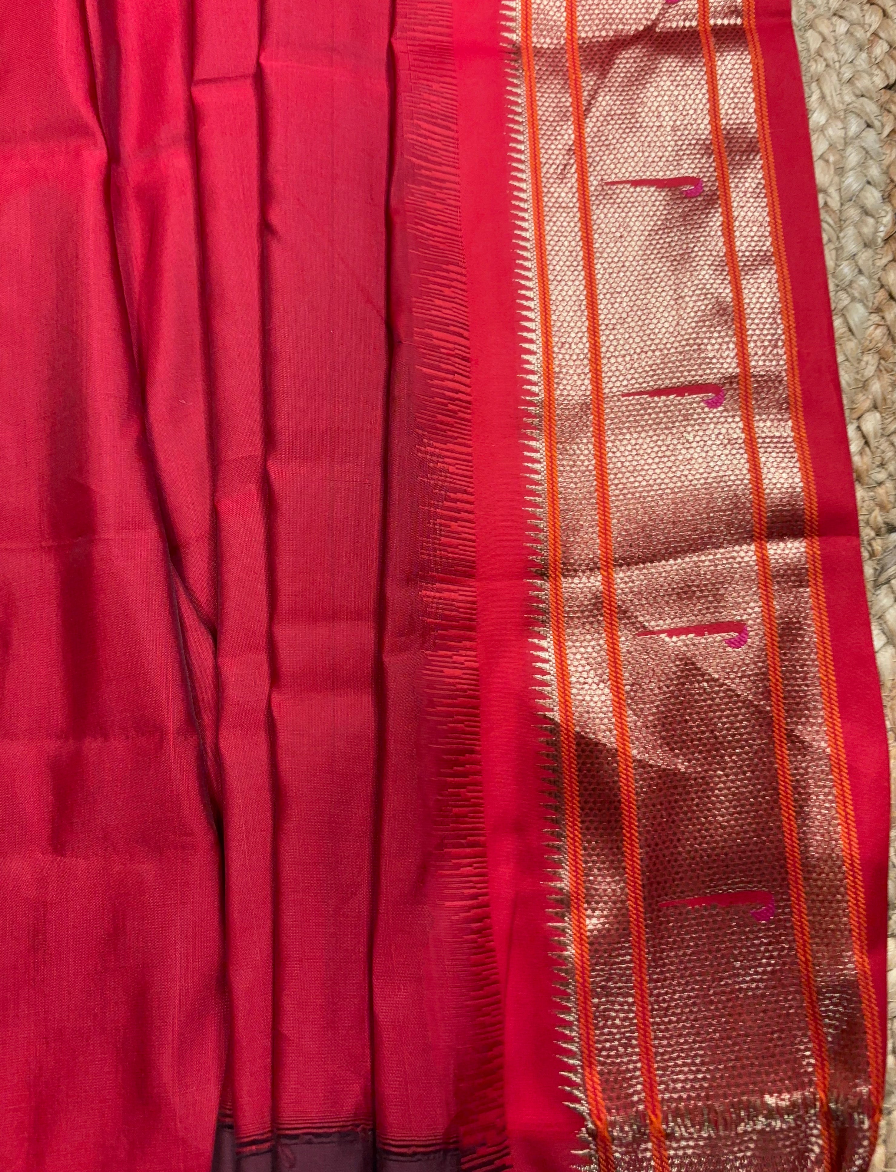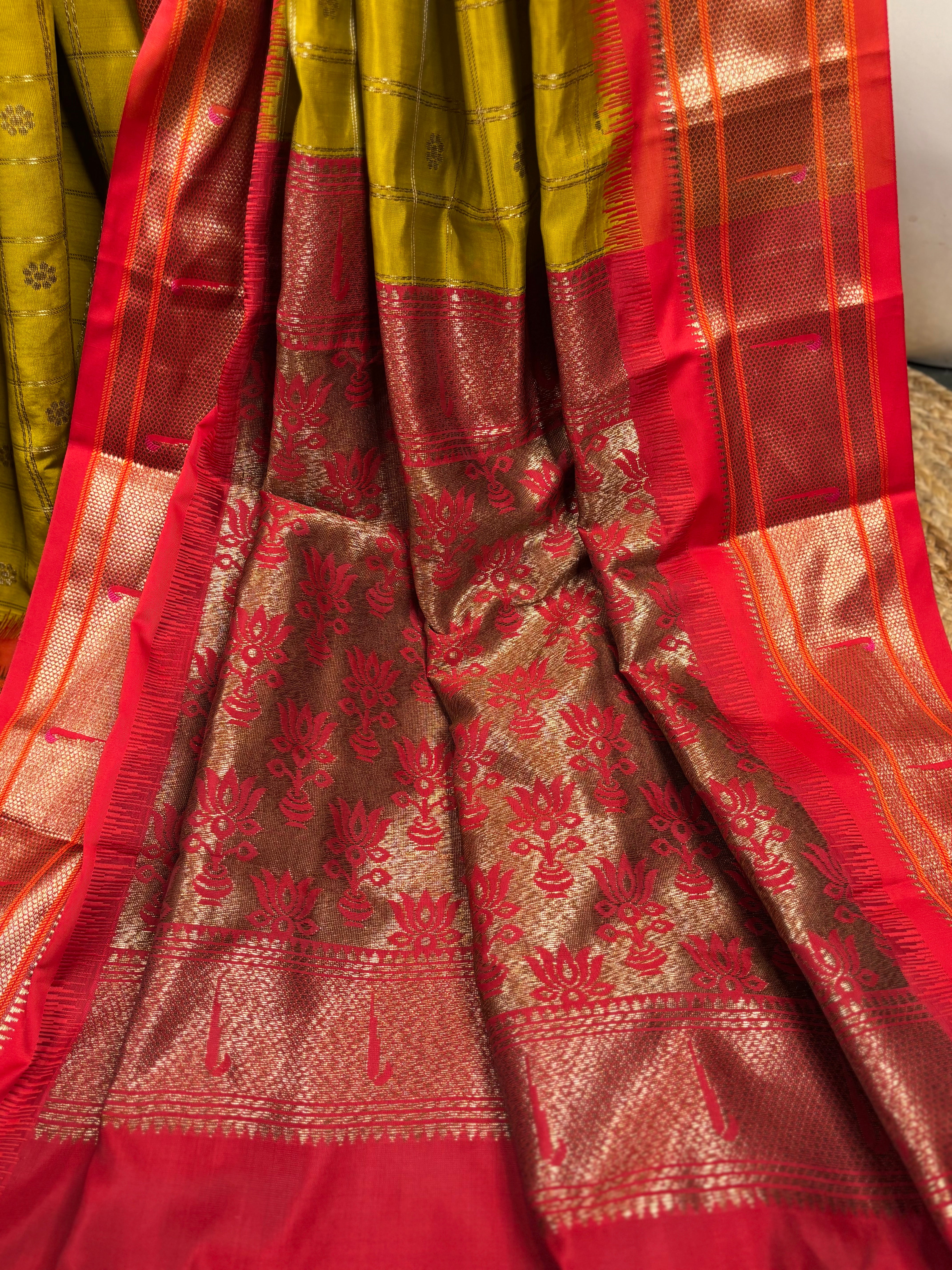 Benarasi semi katan silk - green saree with red border