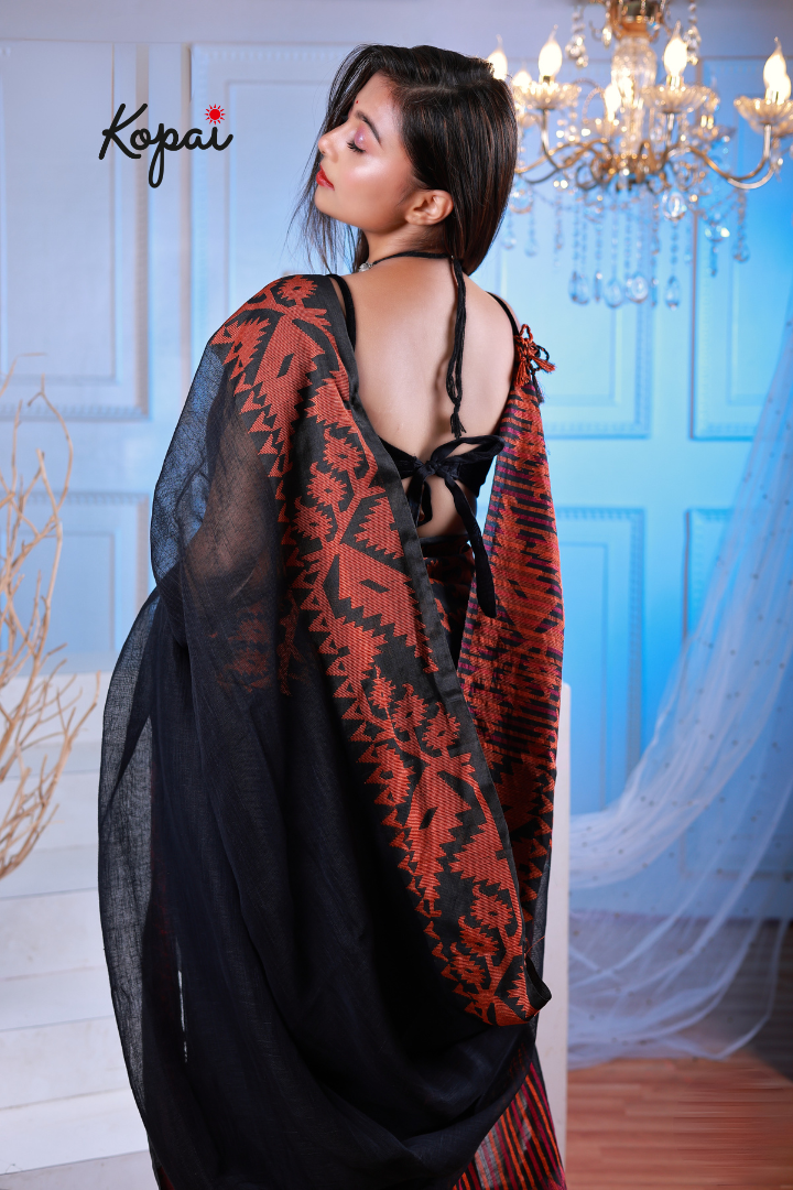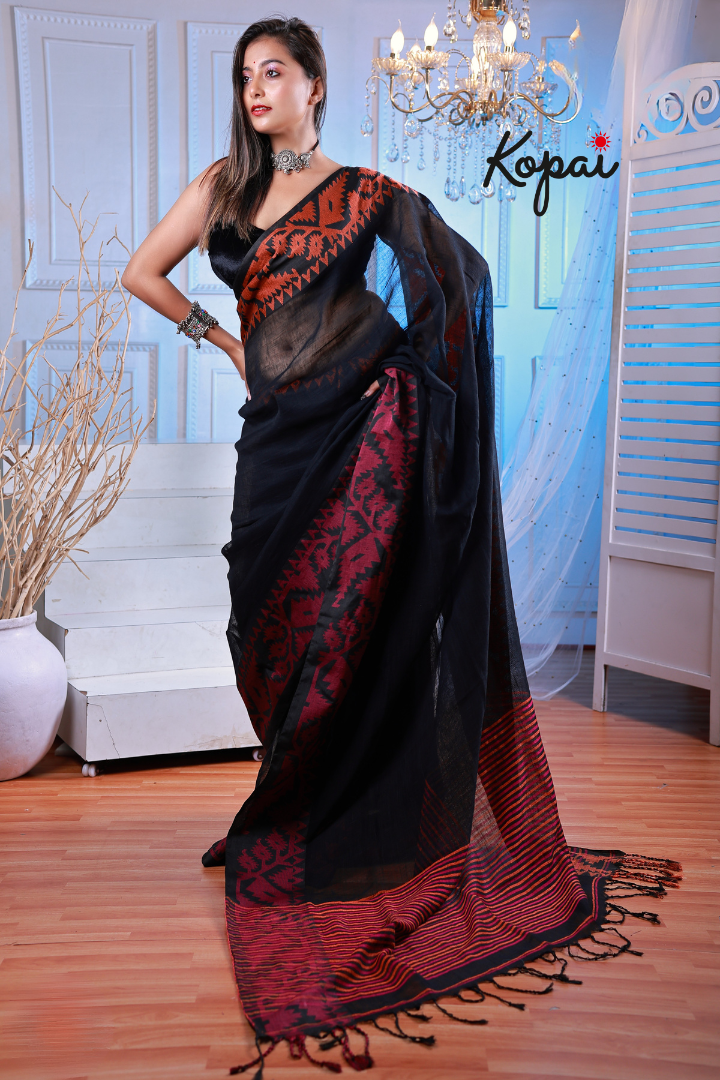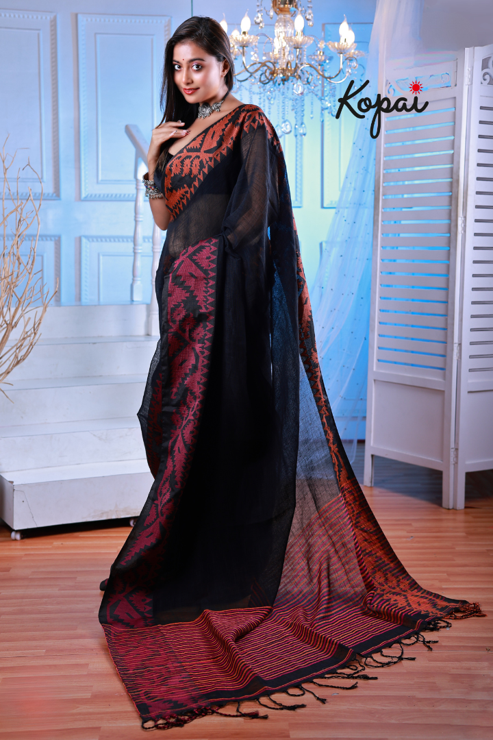 A true expression of Bengal’s handloom heritage, this Black Korat Linen Saree adds understated sophistication, natural elegance, and timeless charm to your wardrobe.
