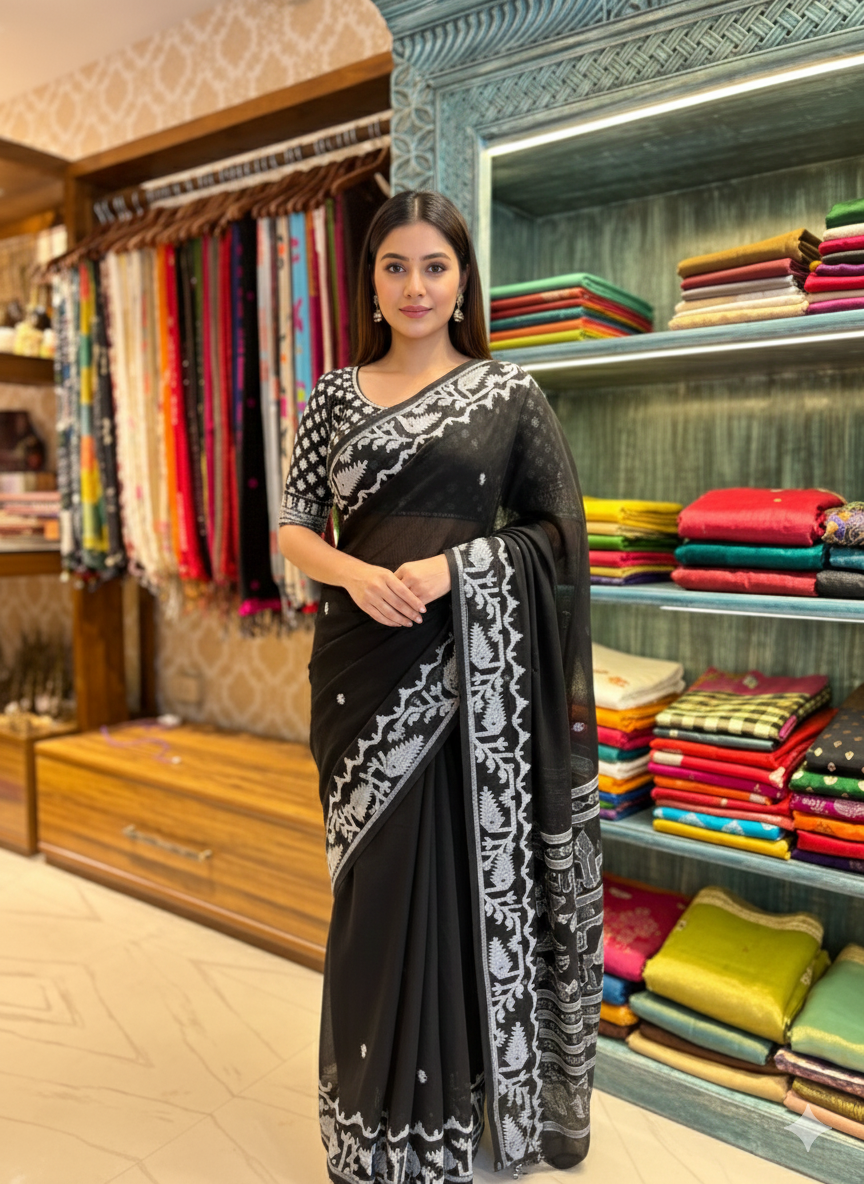 Embrace timeless Bengal tradition with this Bengal Handloom Black Cotton Korat Jamdani Saree, a perfect blend of classic elegance and artisanal craftsmanship. Handwoven by skilled weavers, this saree features delicate Korat Jamdani motifs that appear to float gracefully on a rich black cotton base, offering both sophistication and comfort. Lightweight and breathable, it is ideal for all-day wear during cultural and festive occasions.