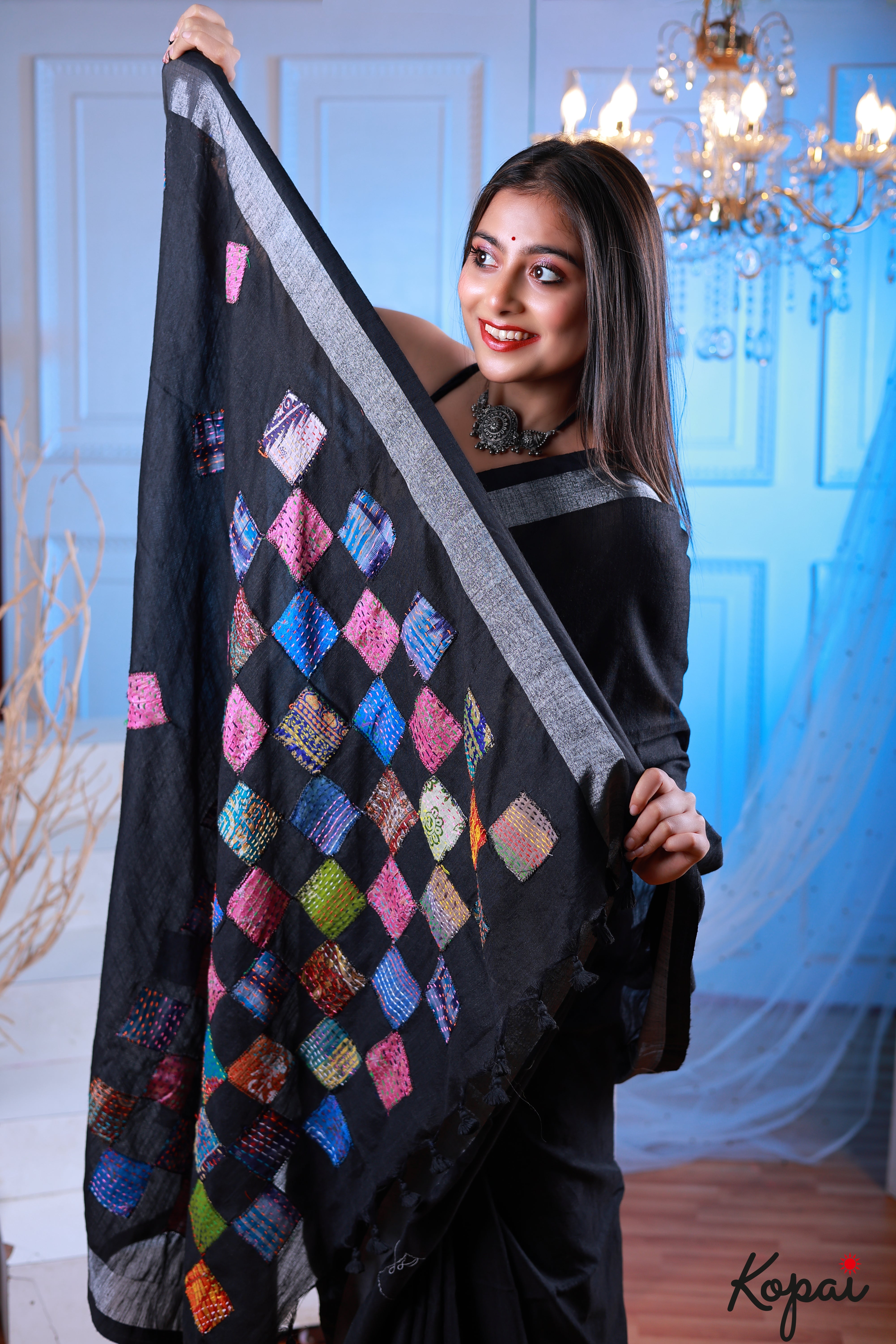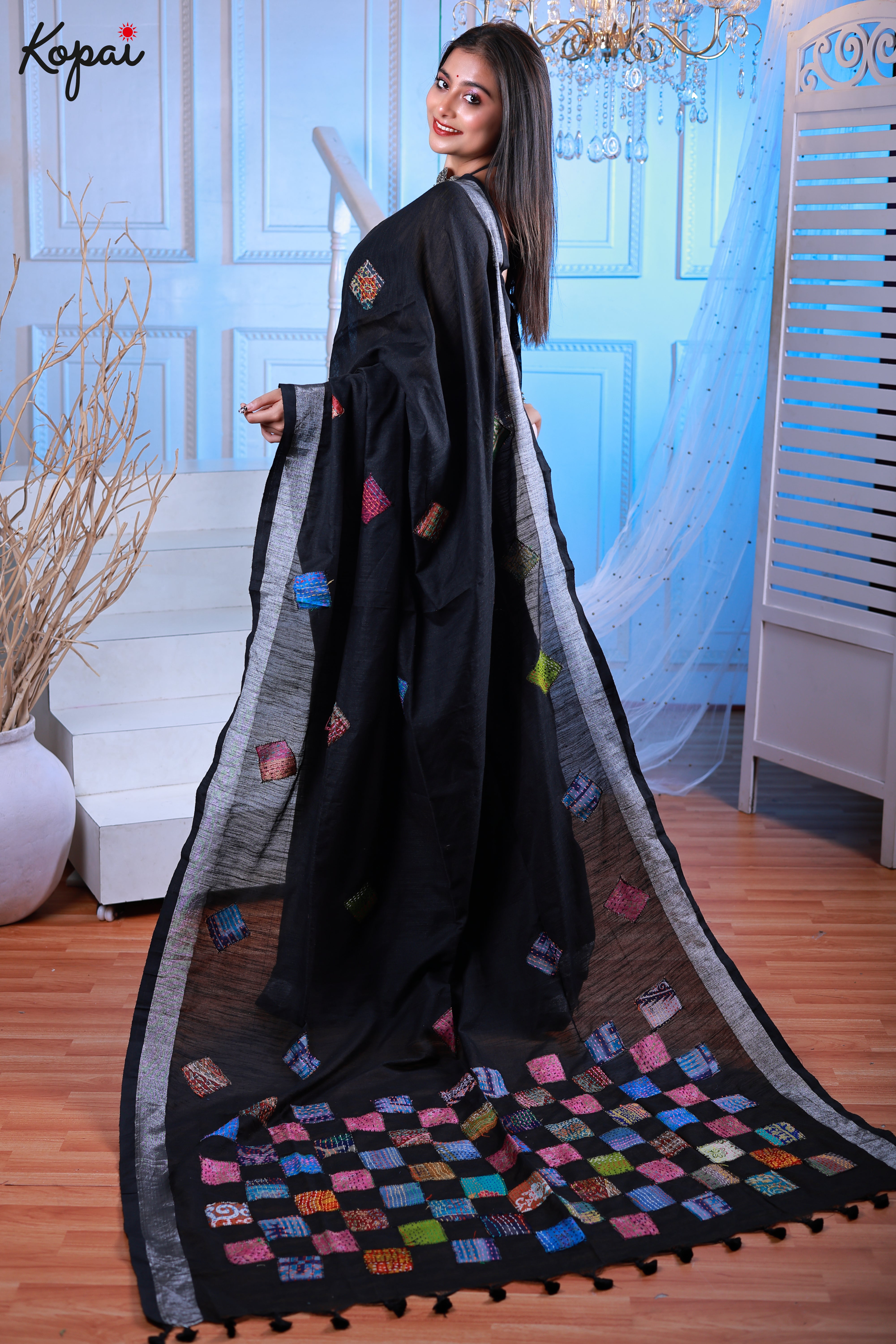 Cotton black saree with katha stitch and applique work