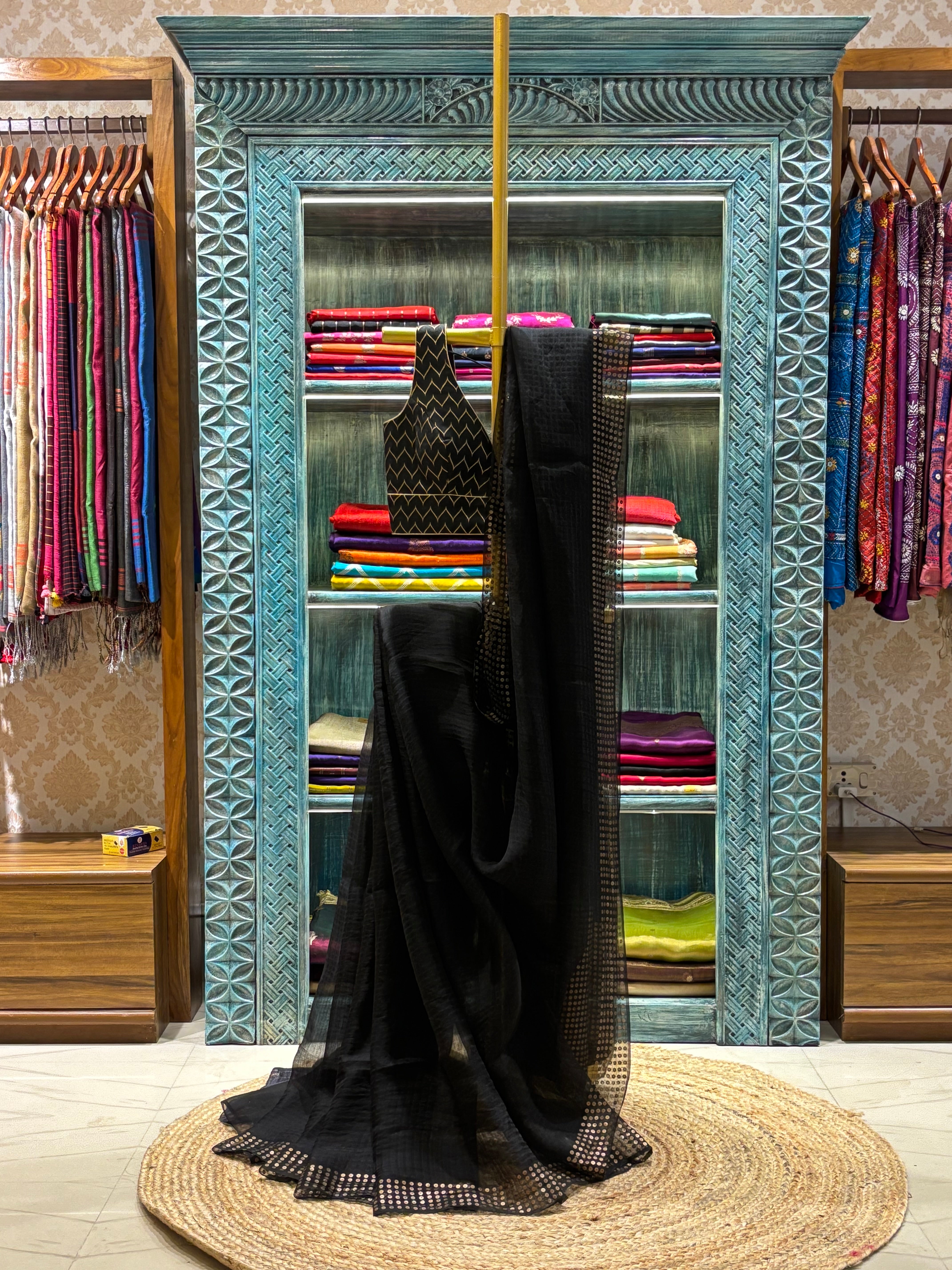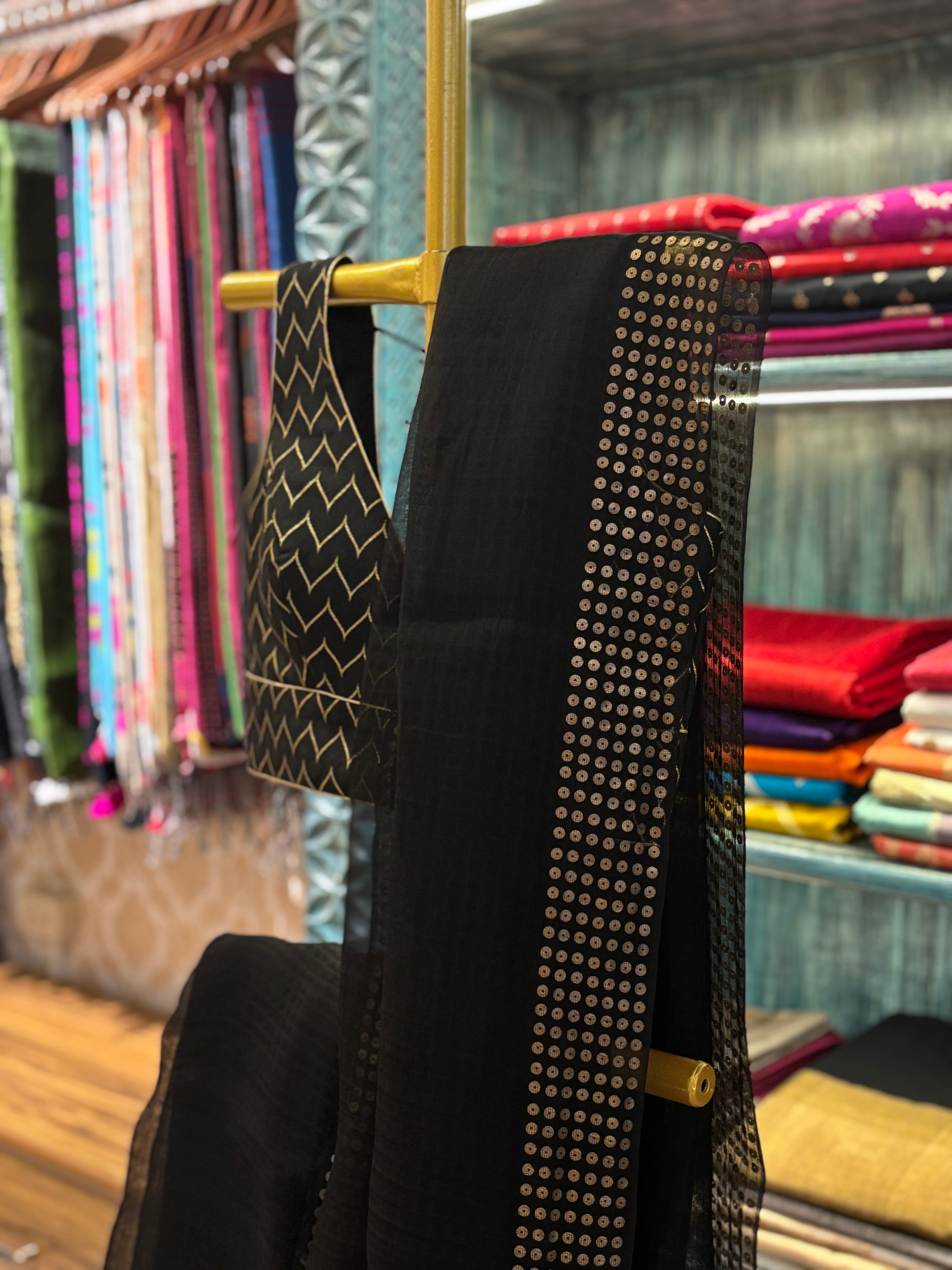Step into effortless glamour with our pure resham sequin saree in classic black. Lightweight, graceful, and beautifully detailed, it exudes timeless sophistication for parties, weddings, or any special occasion.