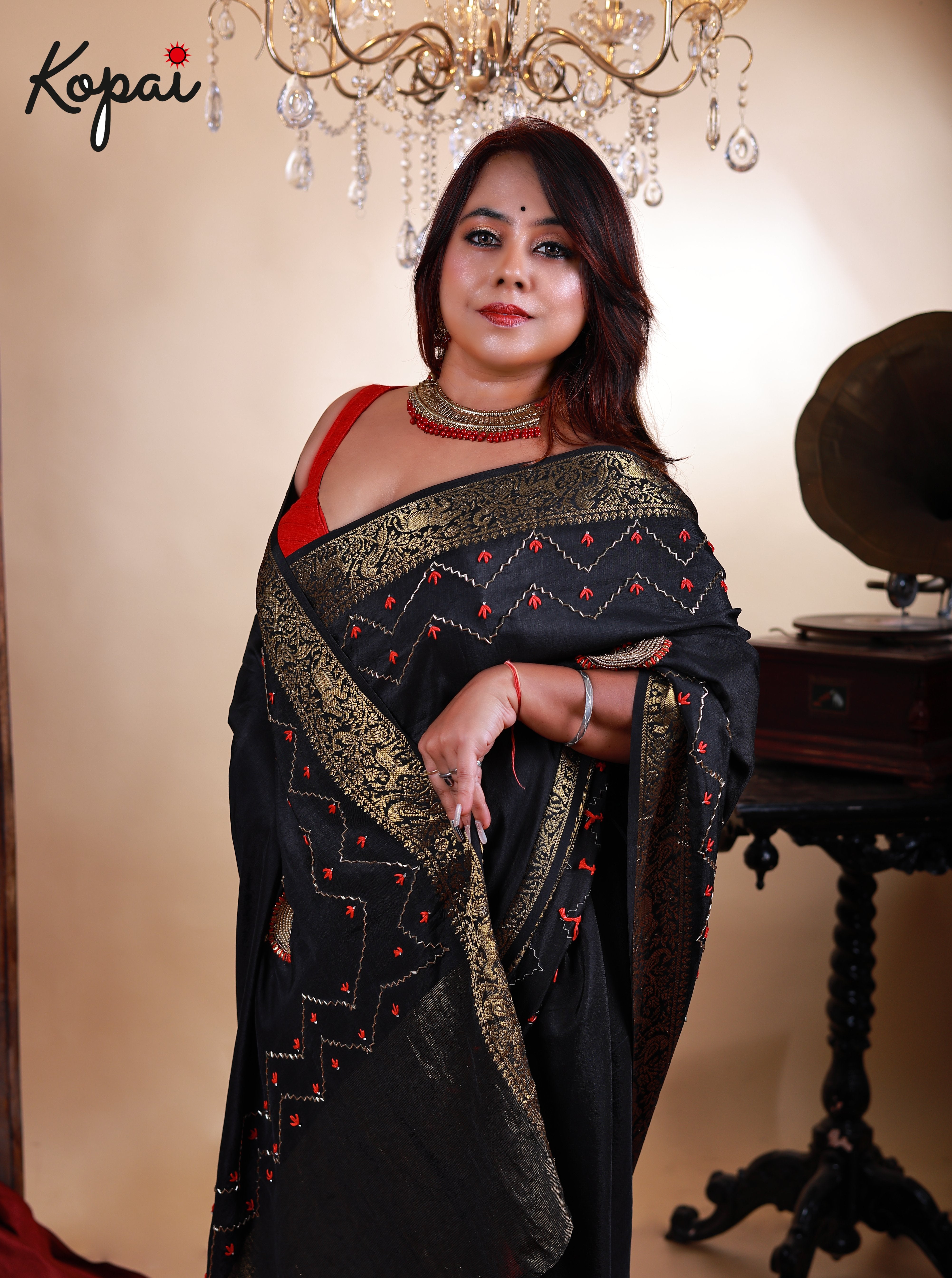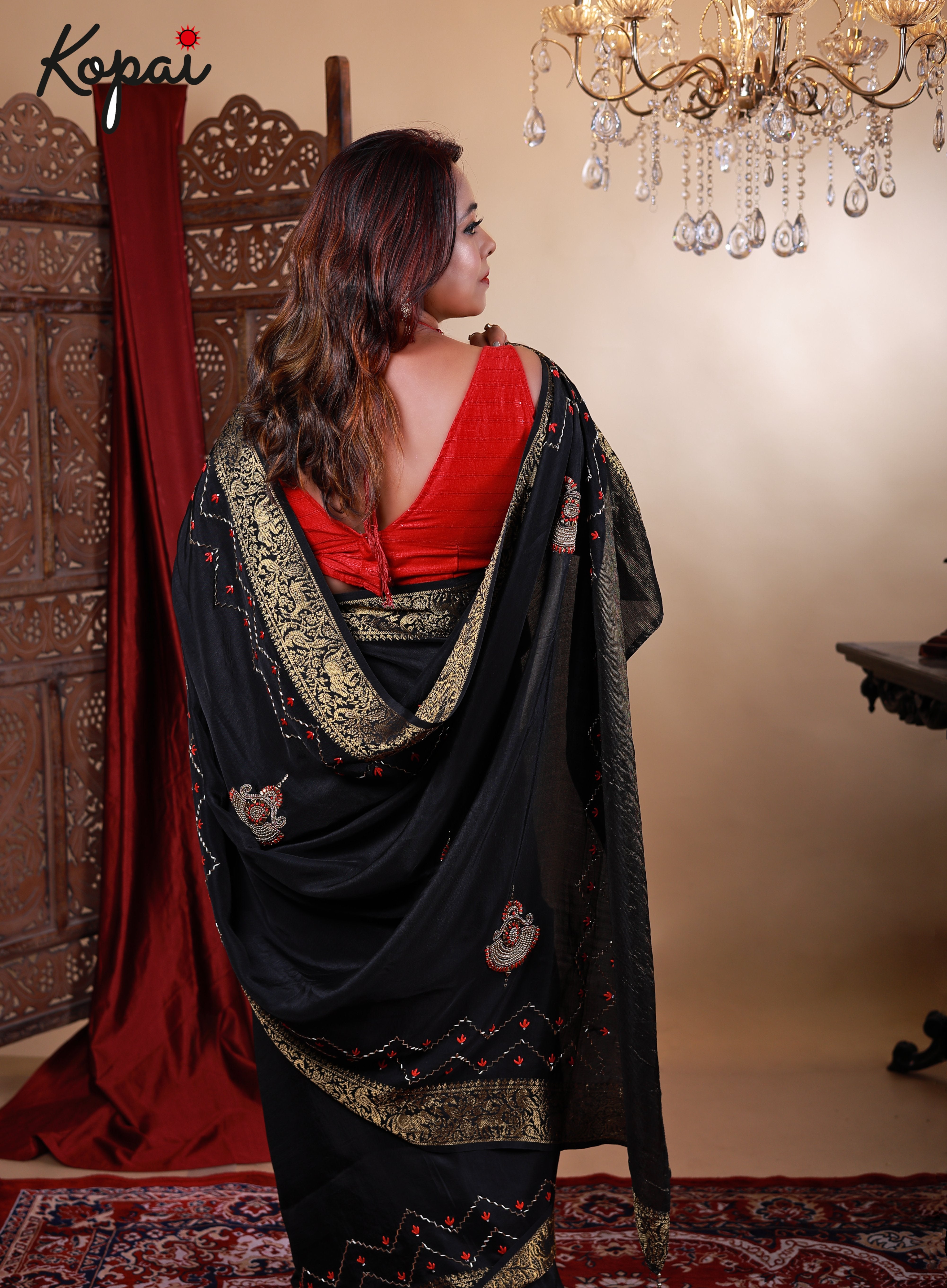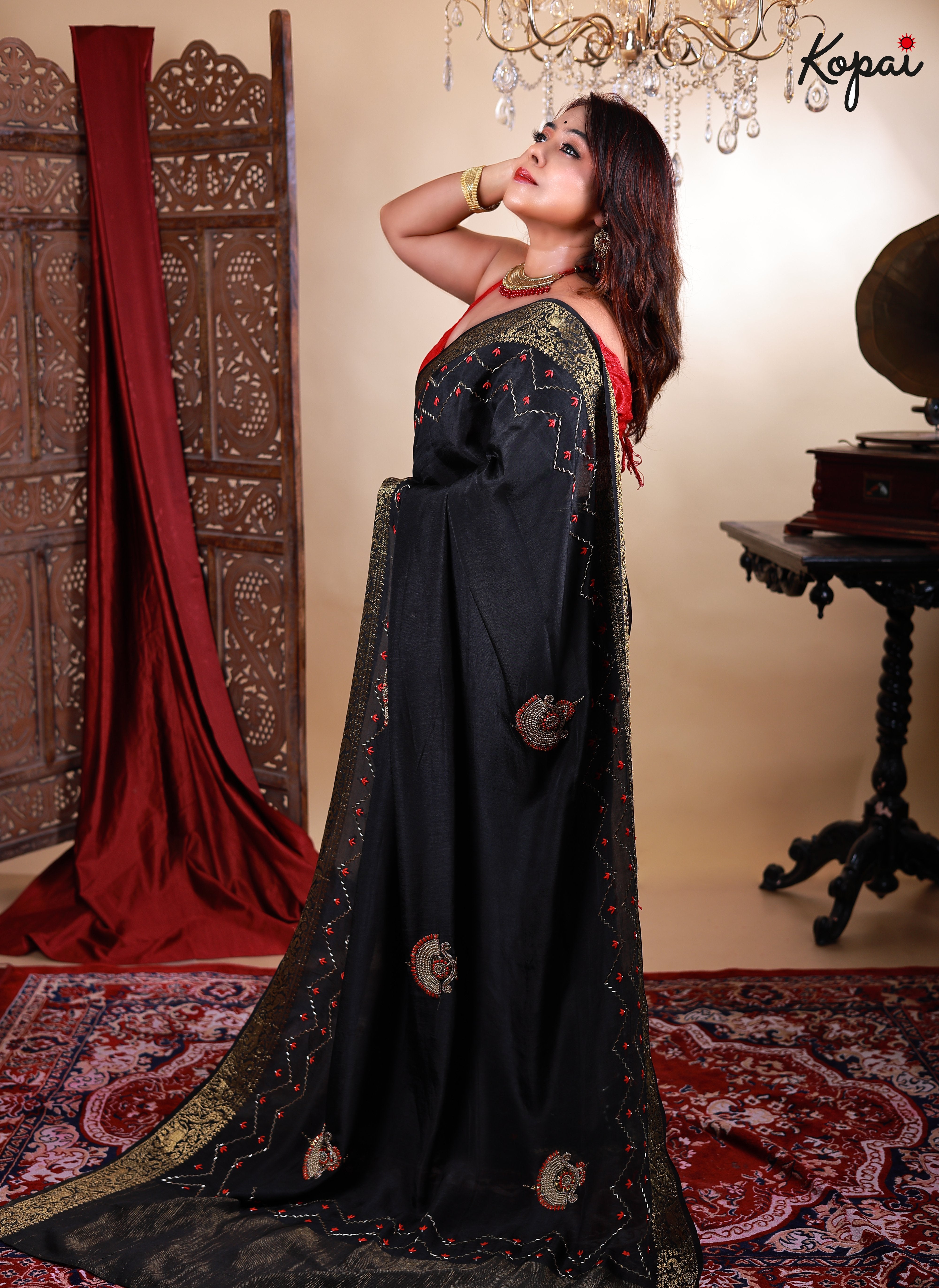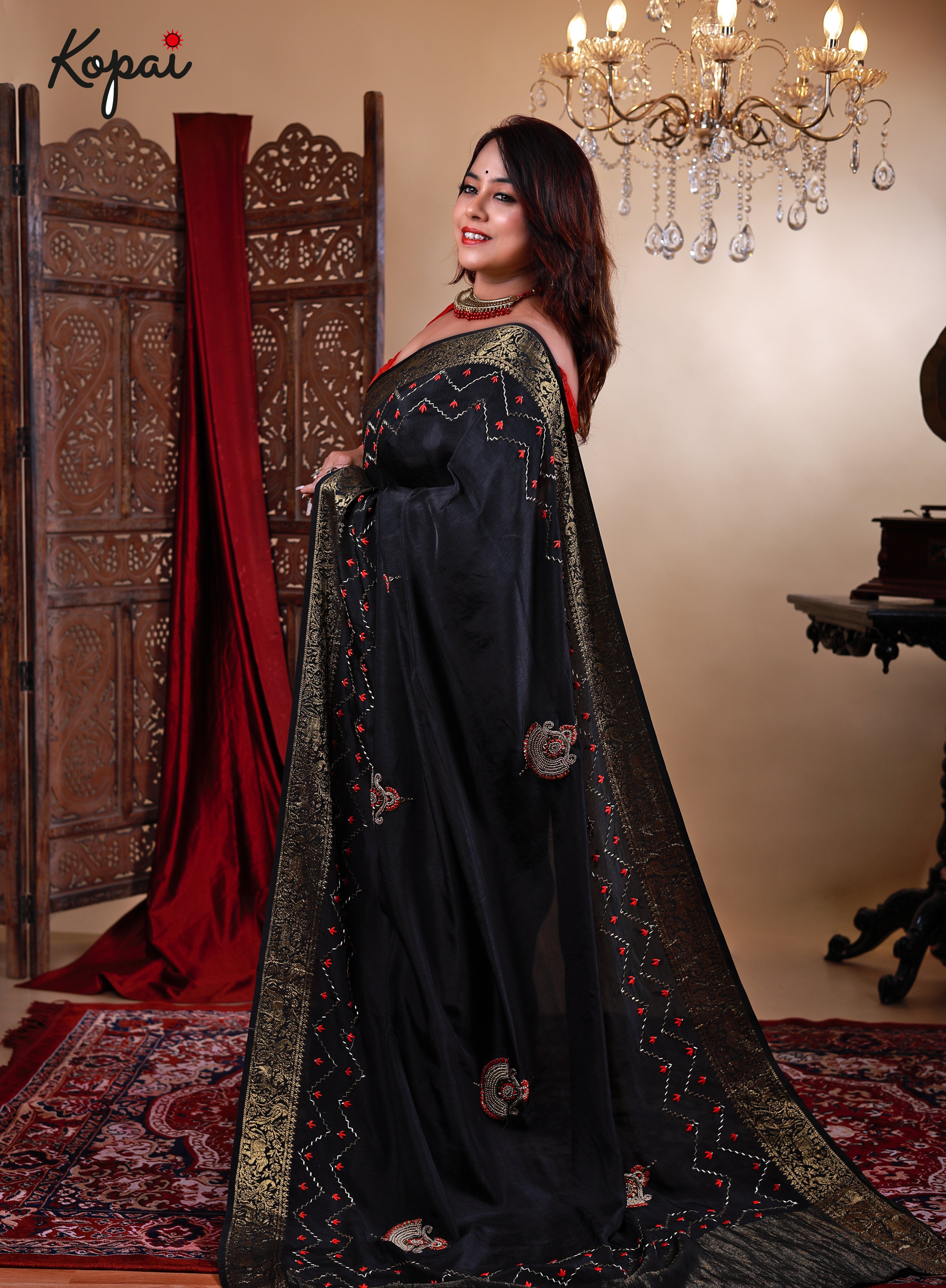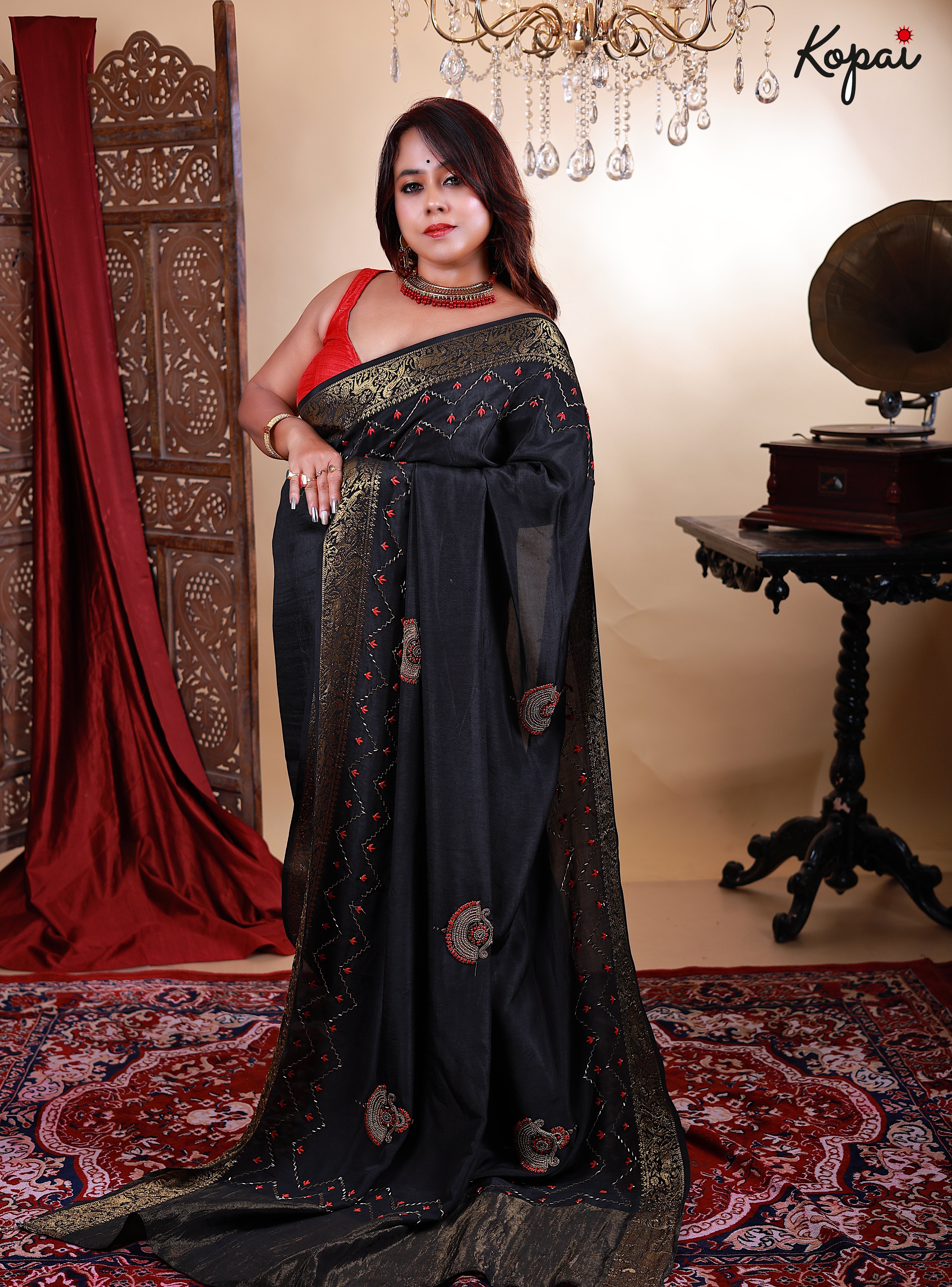 Black satin saree