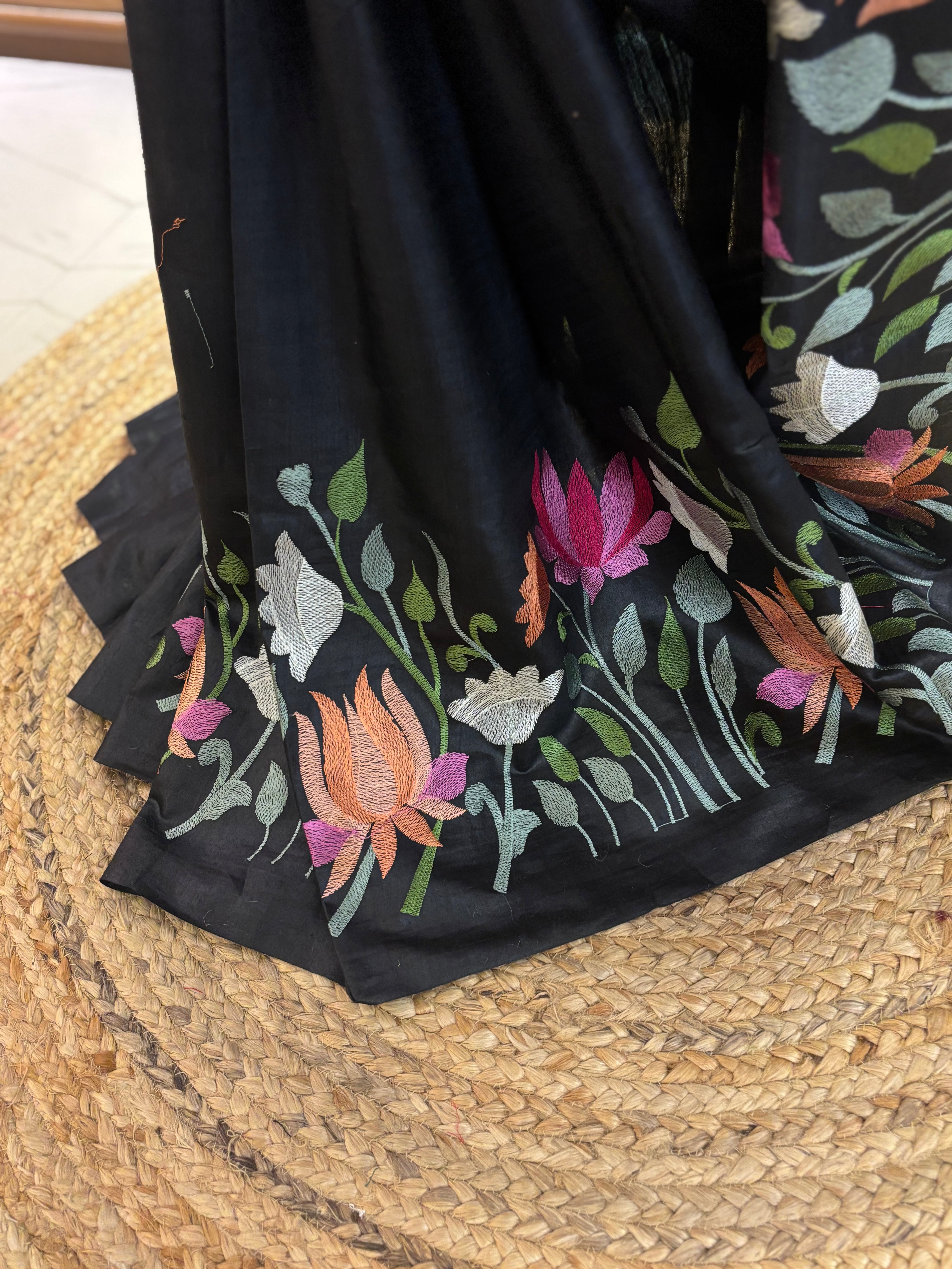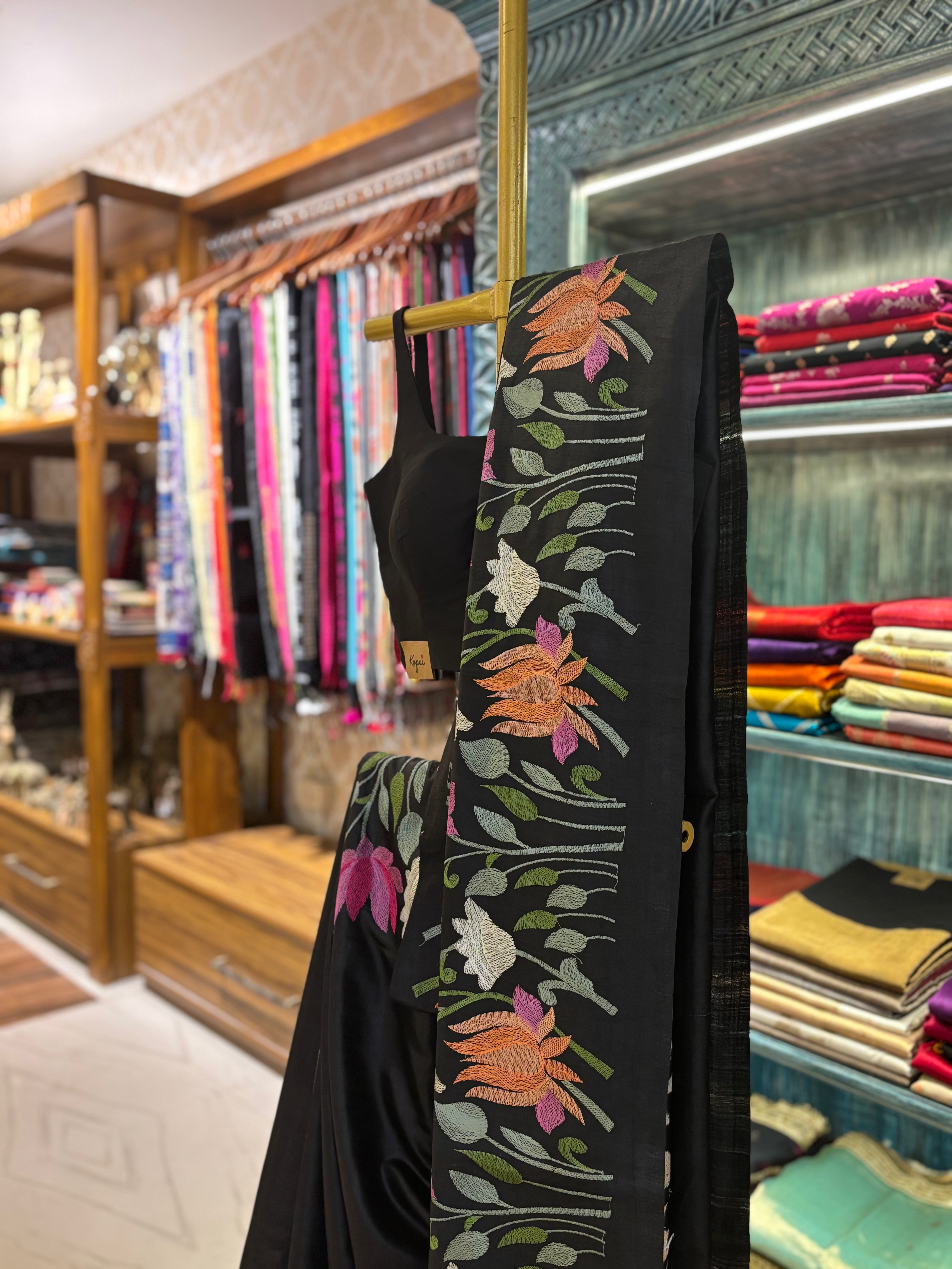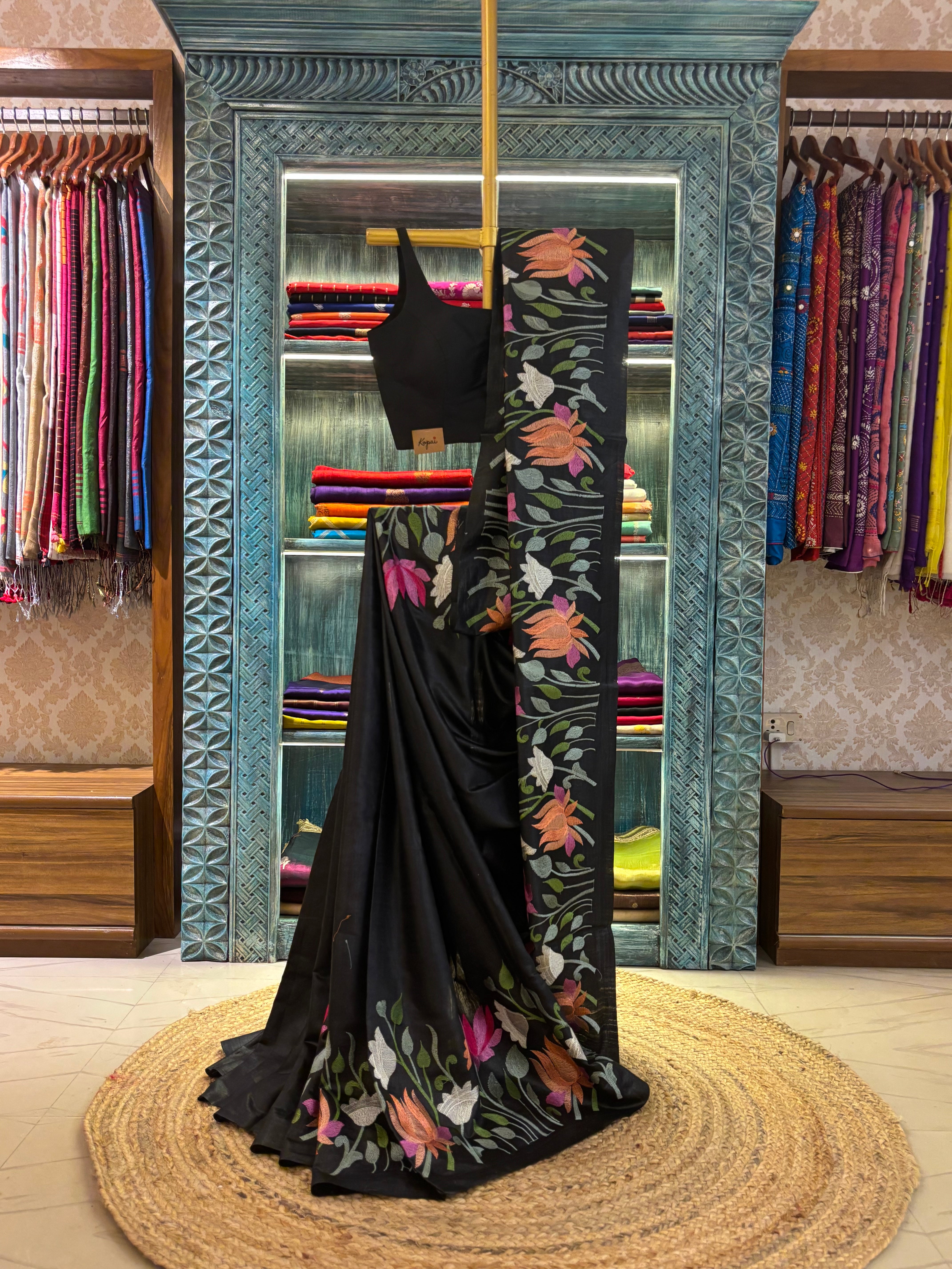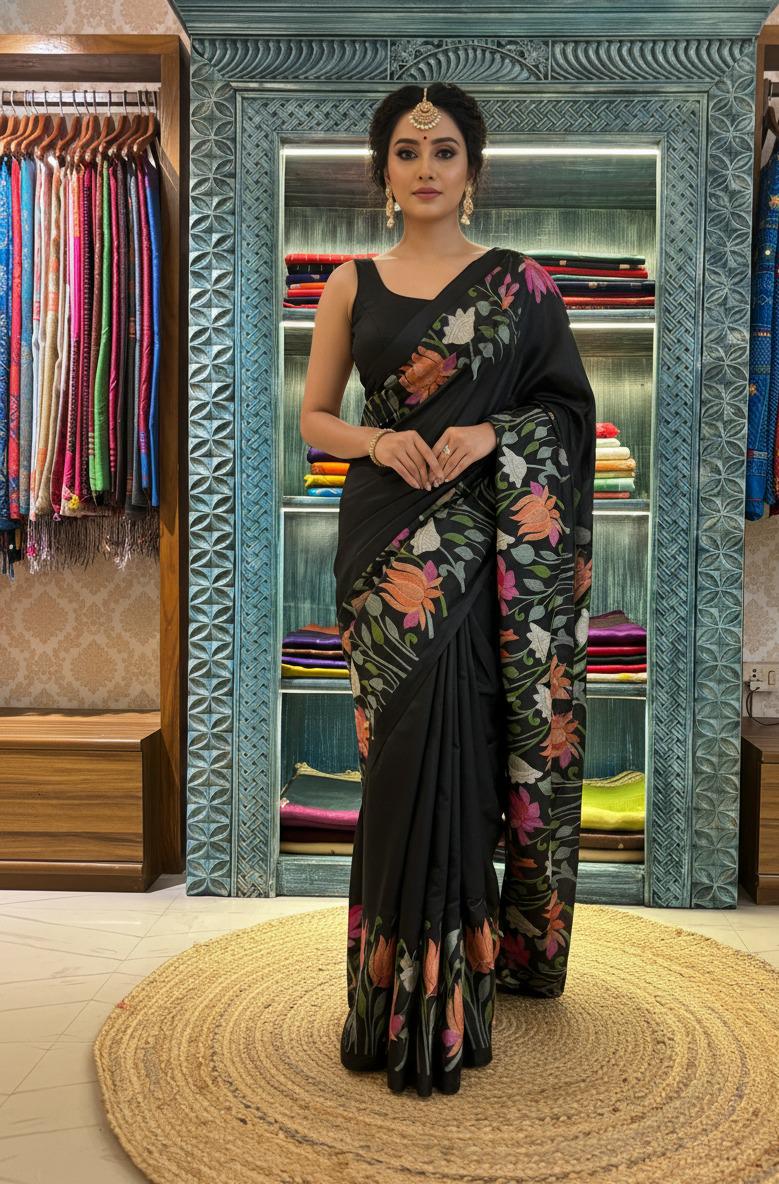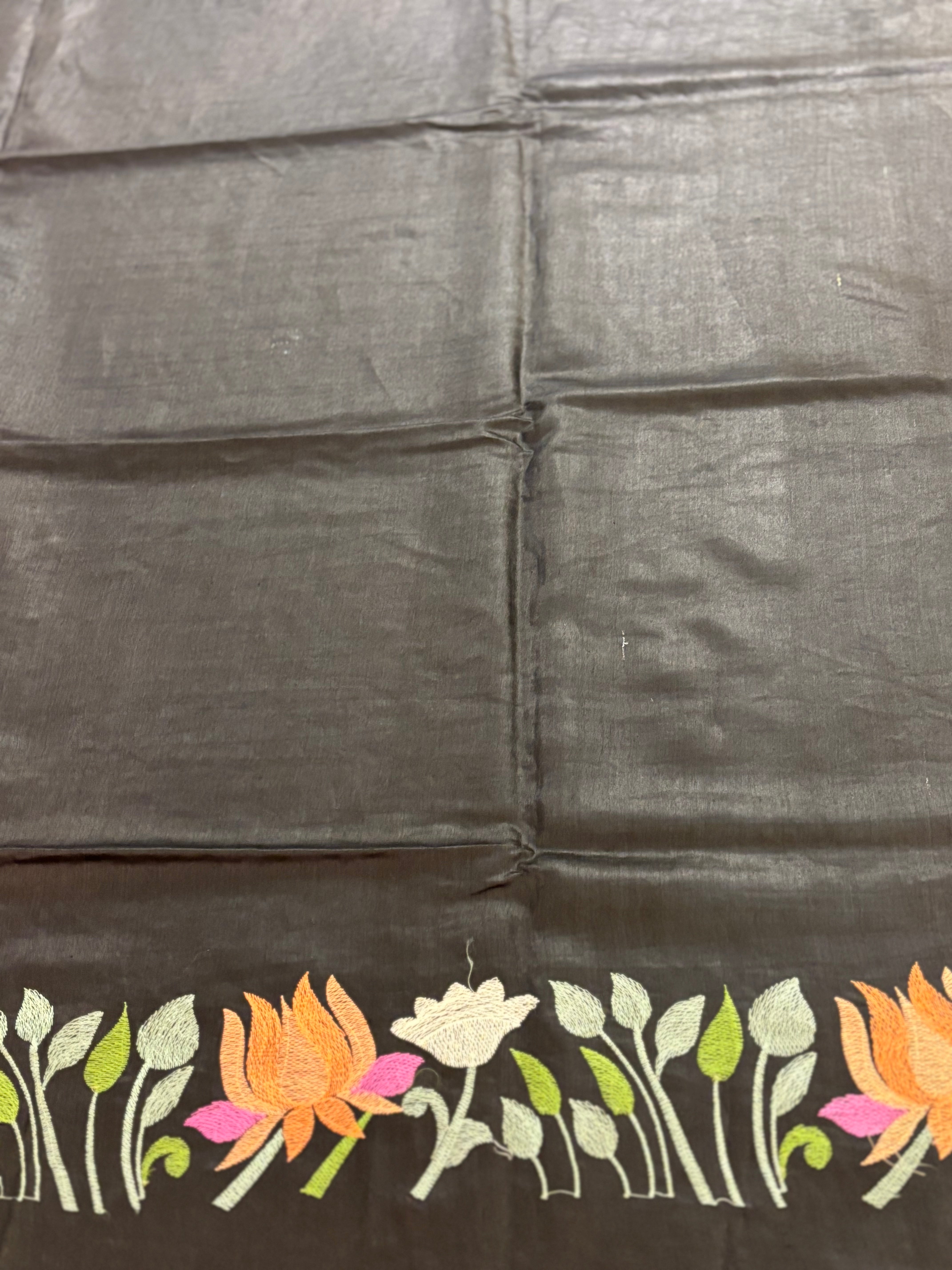 Draped in timeless elegance, this Black Tussar Embroidery Saree blends the raw charm of natural Tussar silk with the finesse of intricate hand embroidery. The rich black base enhances the fabric’s natural texture, giving it a luxurious yet understated sheen. Delicately embroidered motifs—crafted with precision by skilled artisans—add a graceful contrast, making the saree perfect for festive occasions, evening gatherings, and cultural celebrations.