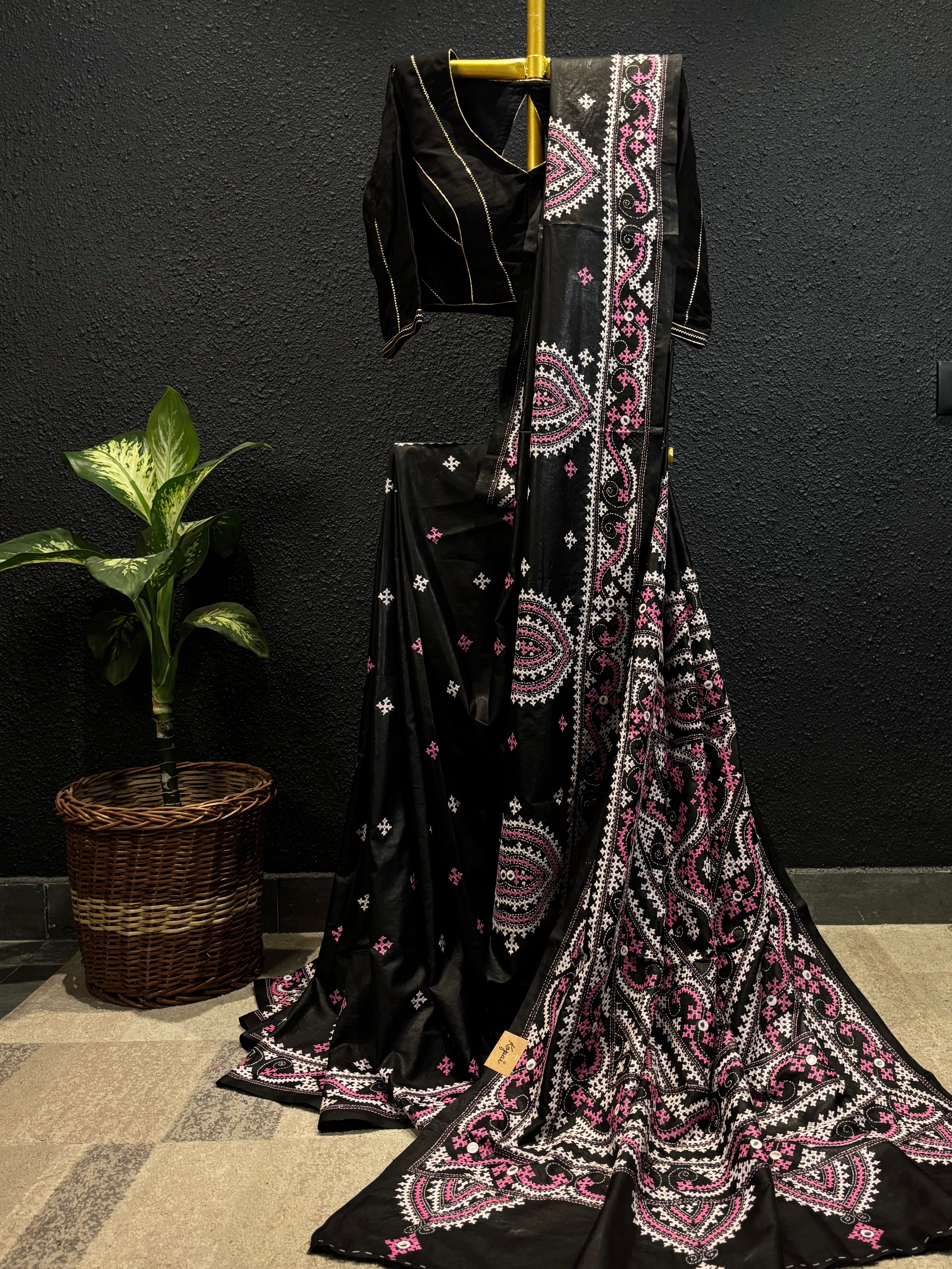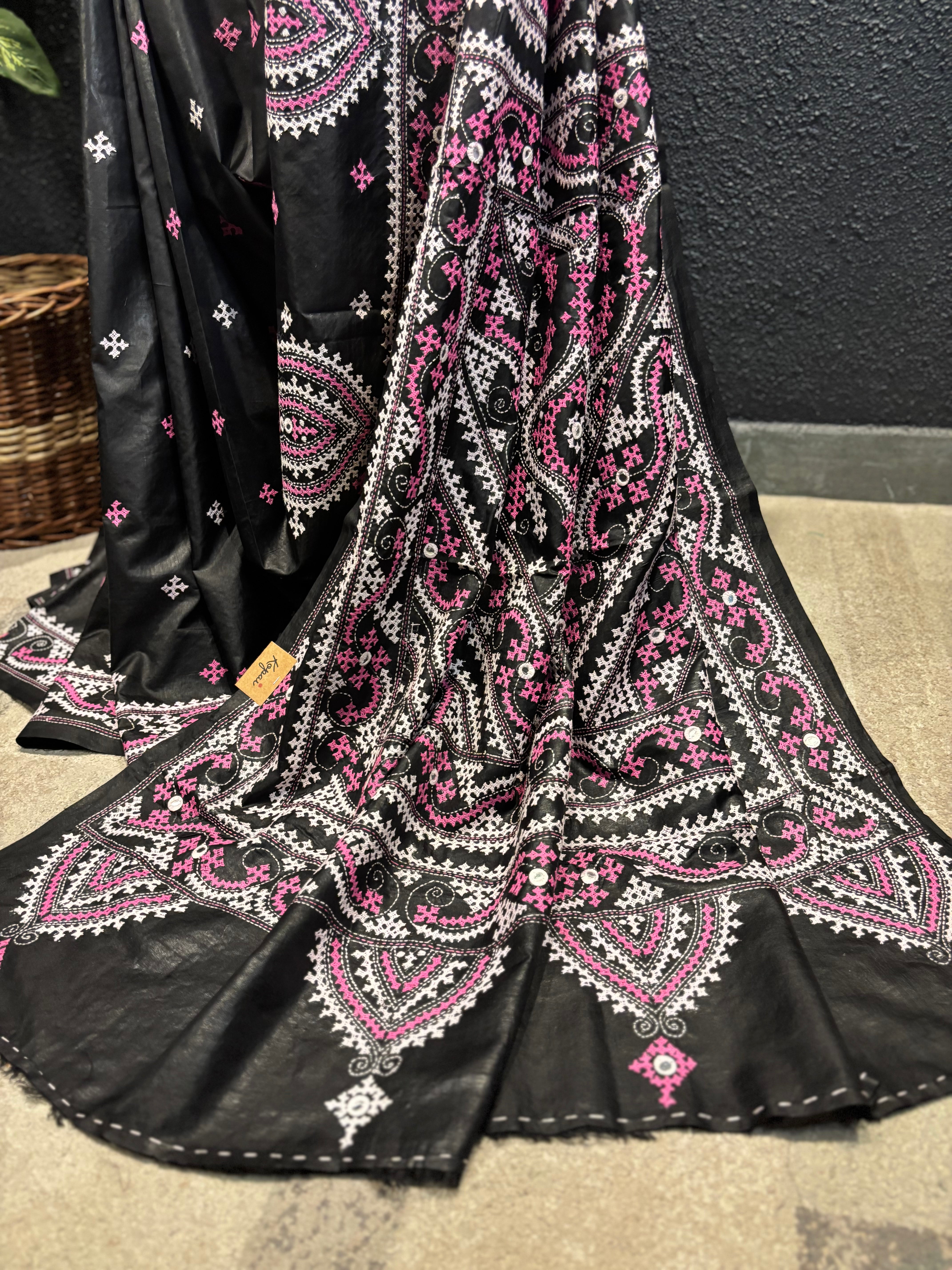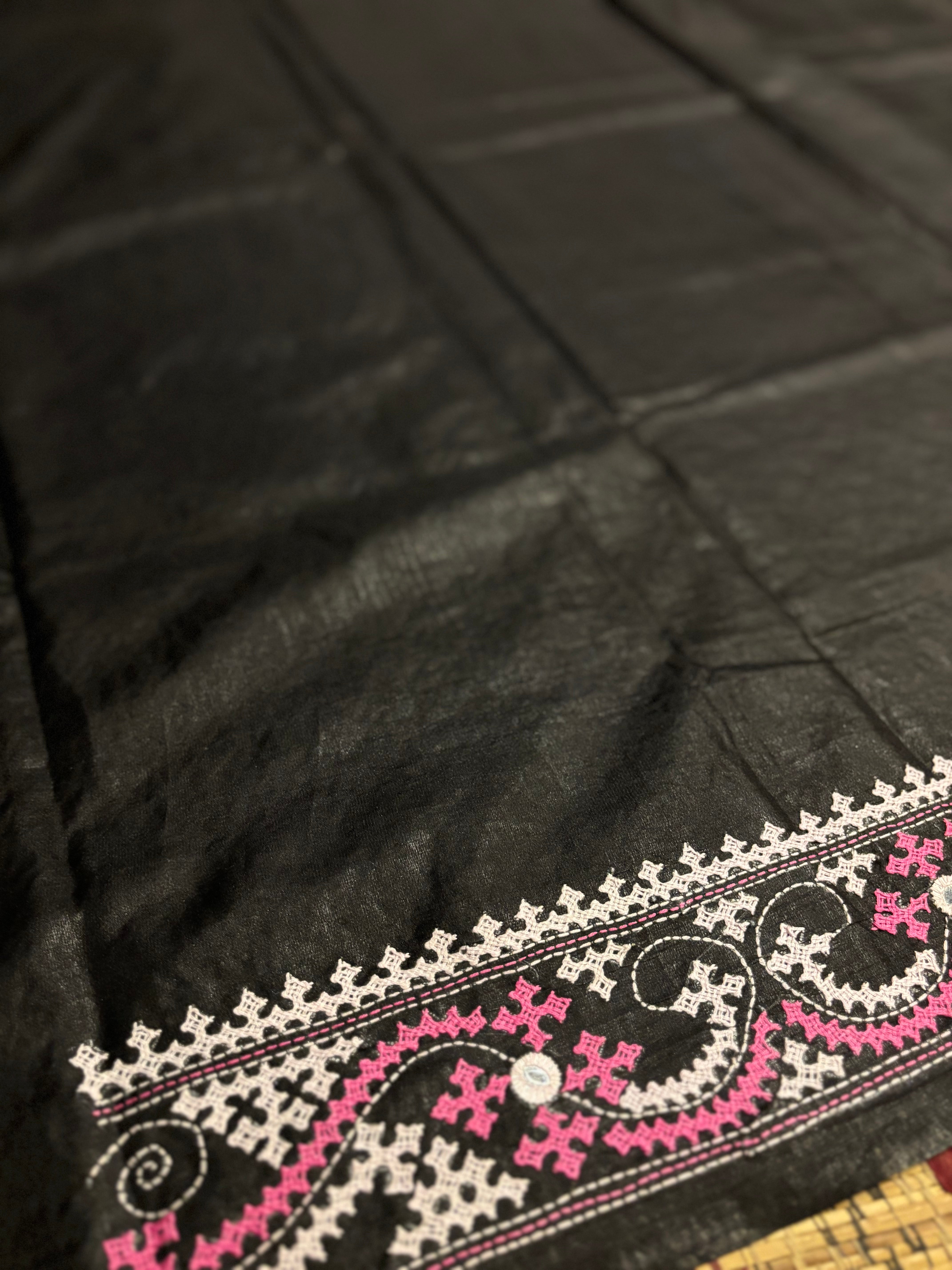 Add a touch of timeless grace to your ethnic wardrobe with this Black Tussar Silk Saree featuring intricate Gujarati mirror... Read more