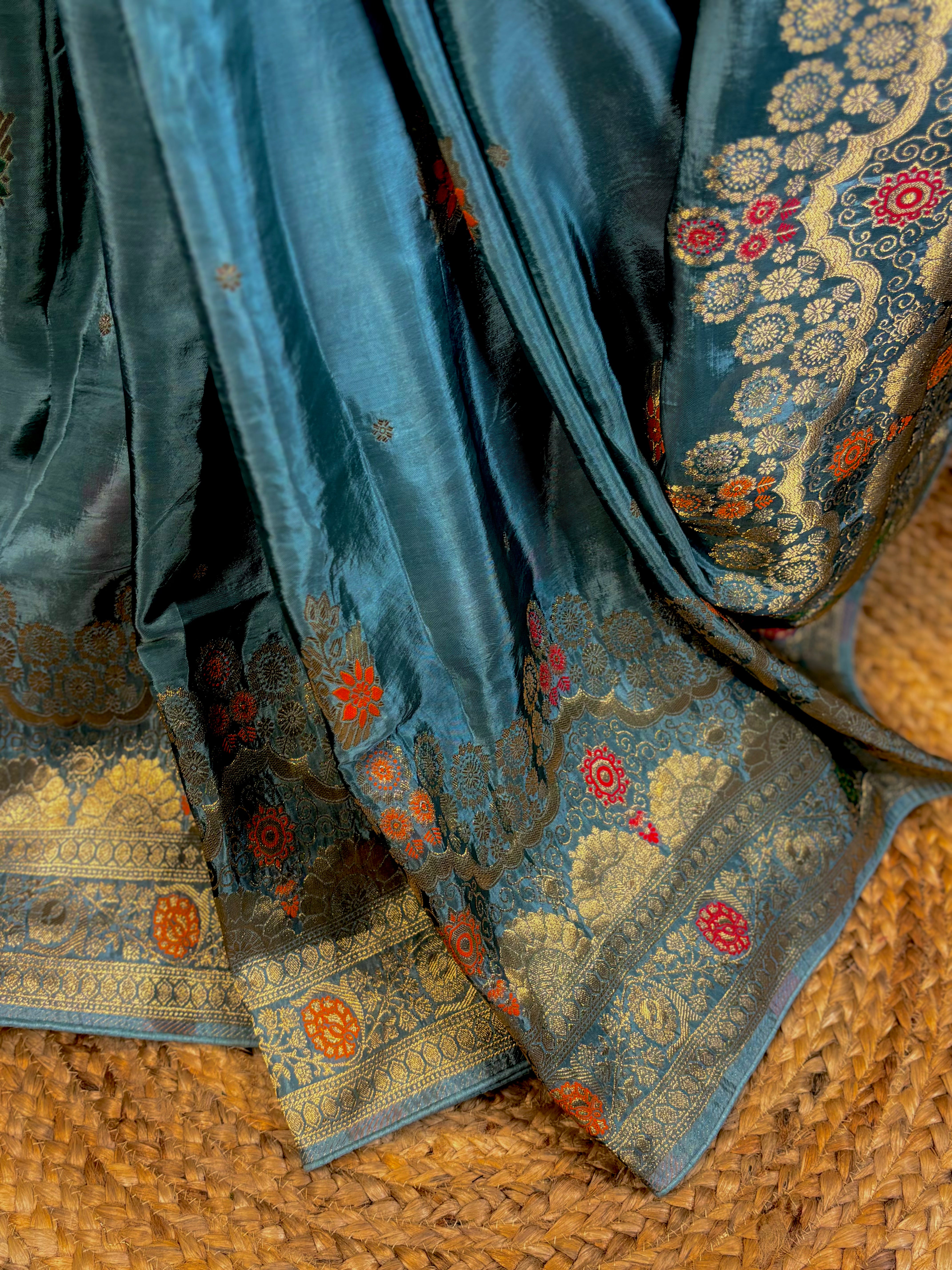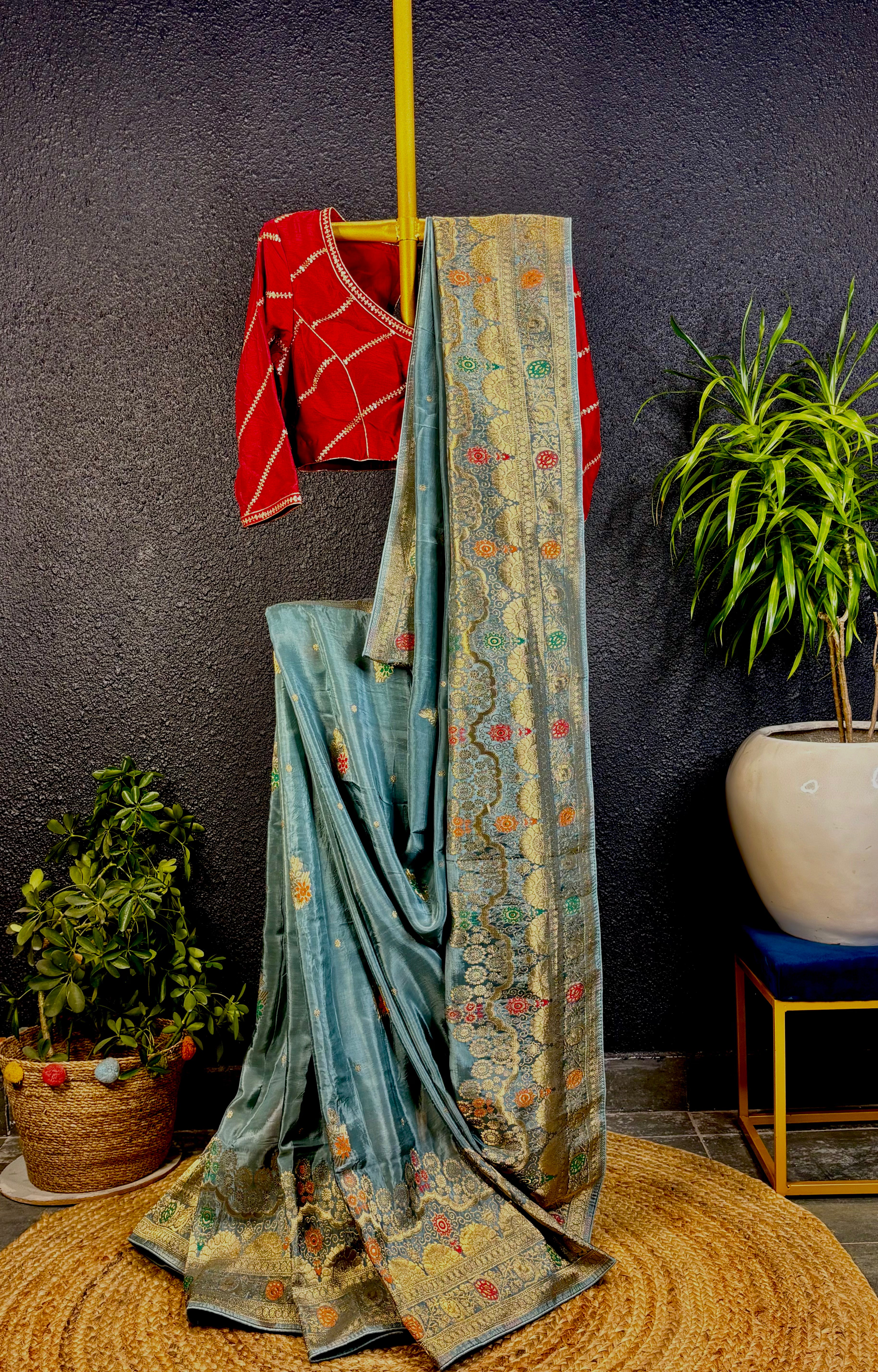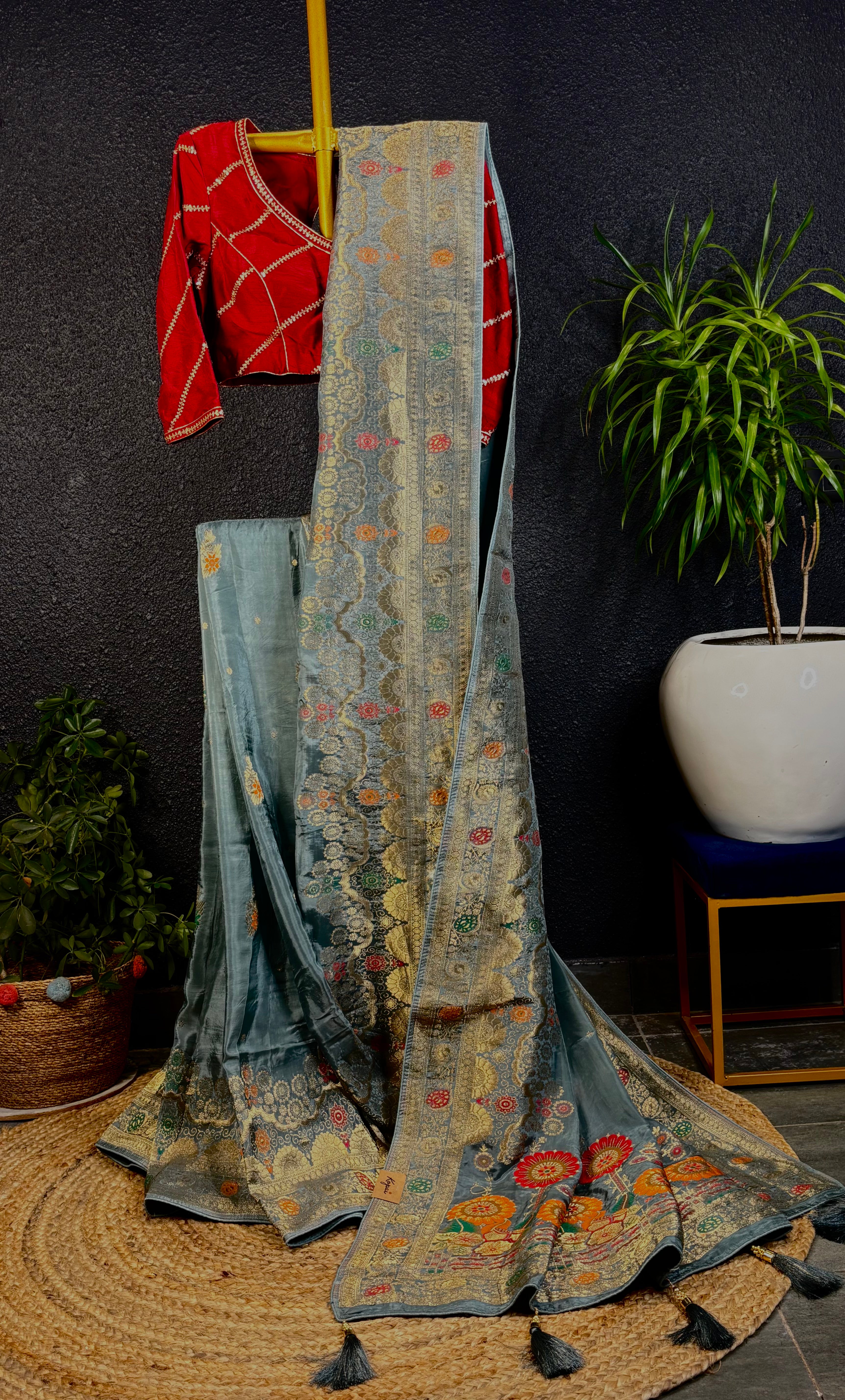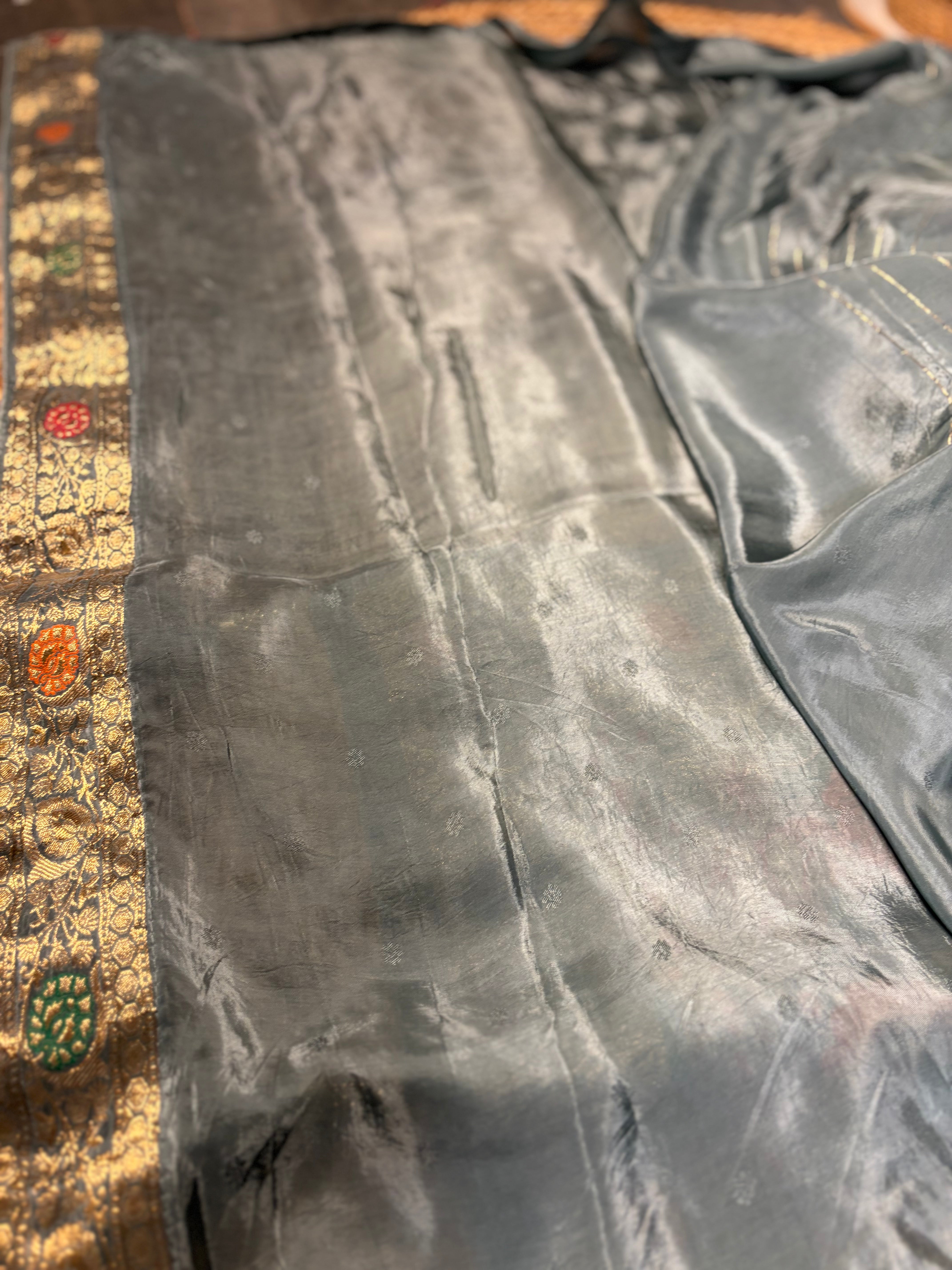 Step into effortless sophistication with this Designer Grey Satin Crepe Saree, beautifully adorned with a luxurious golden border and shimmering golden... Read more