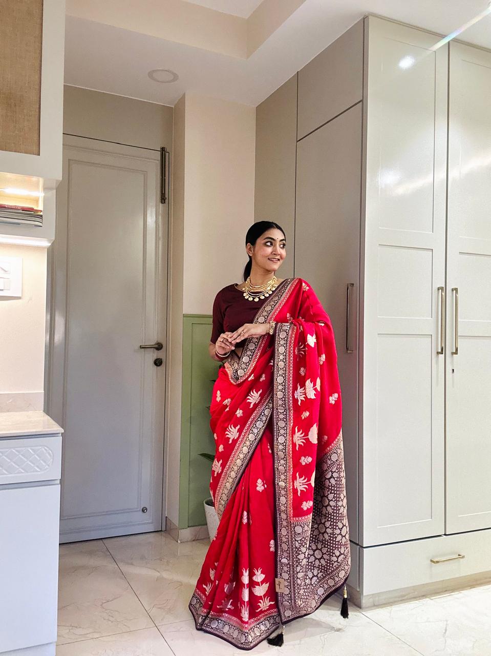 Step into celebration mode with this stunning Red Satin Crepe Saree from the Party Wear Collection. The smooth satin crepe... Read more