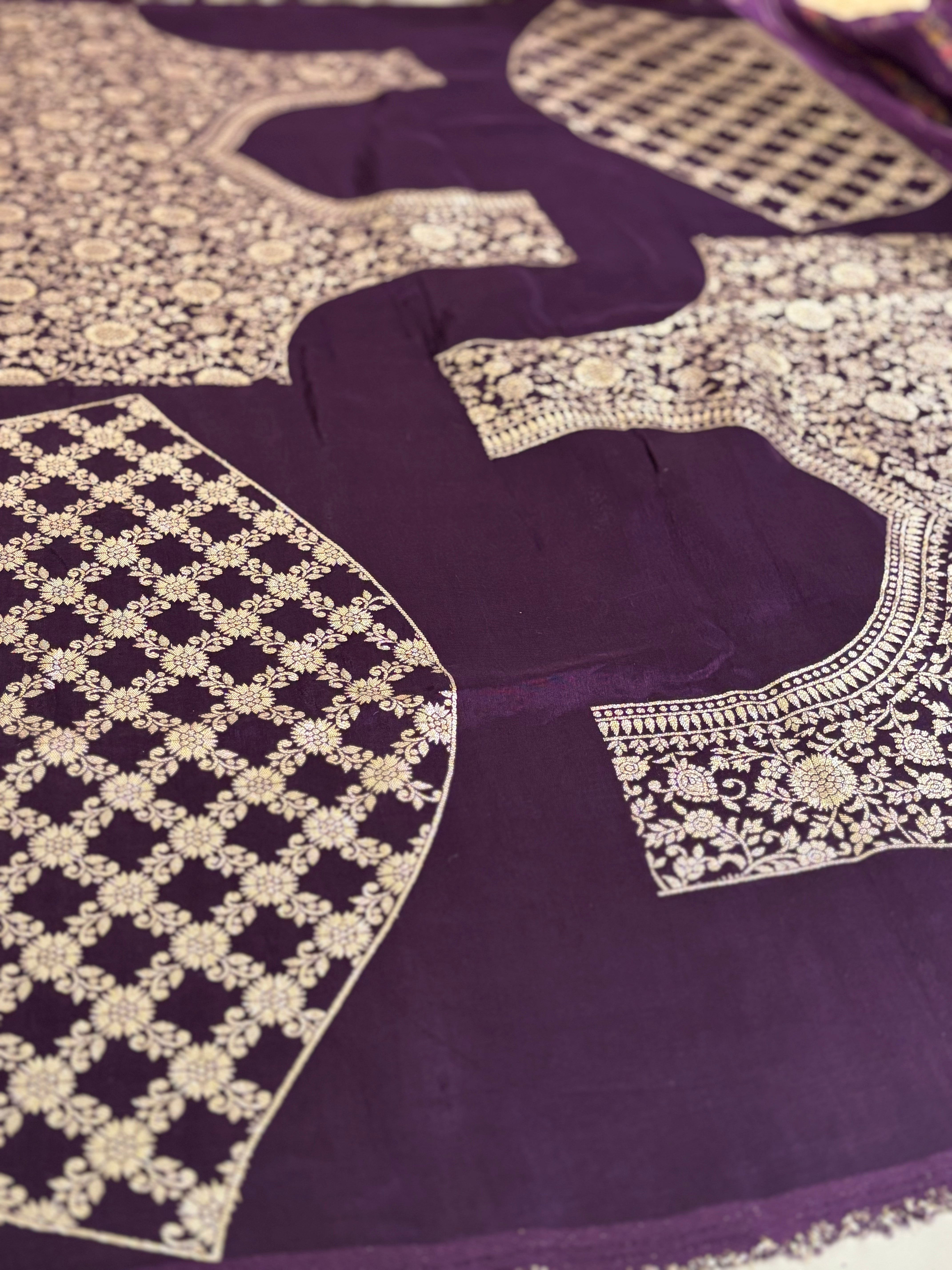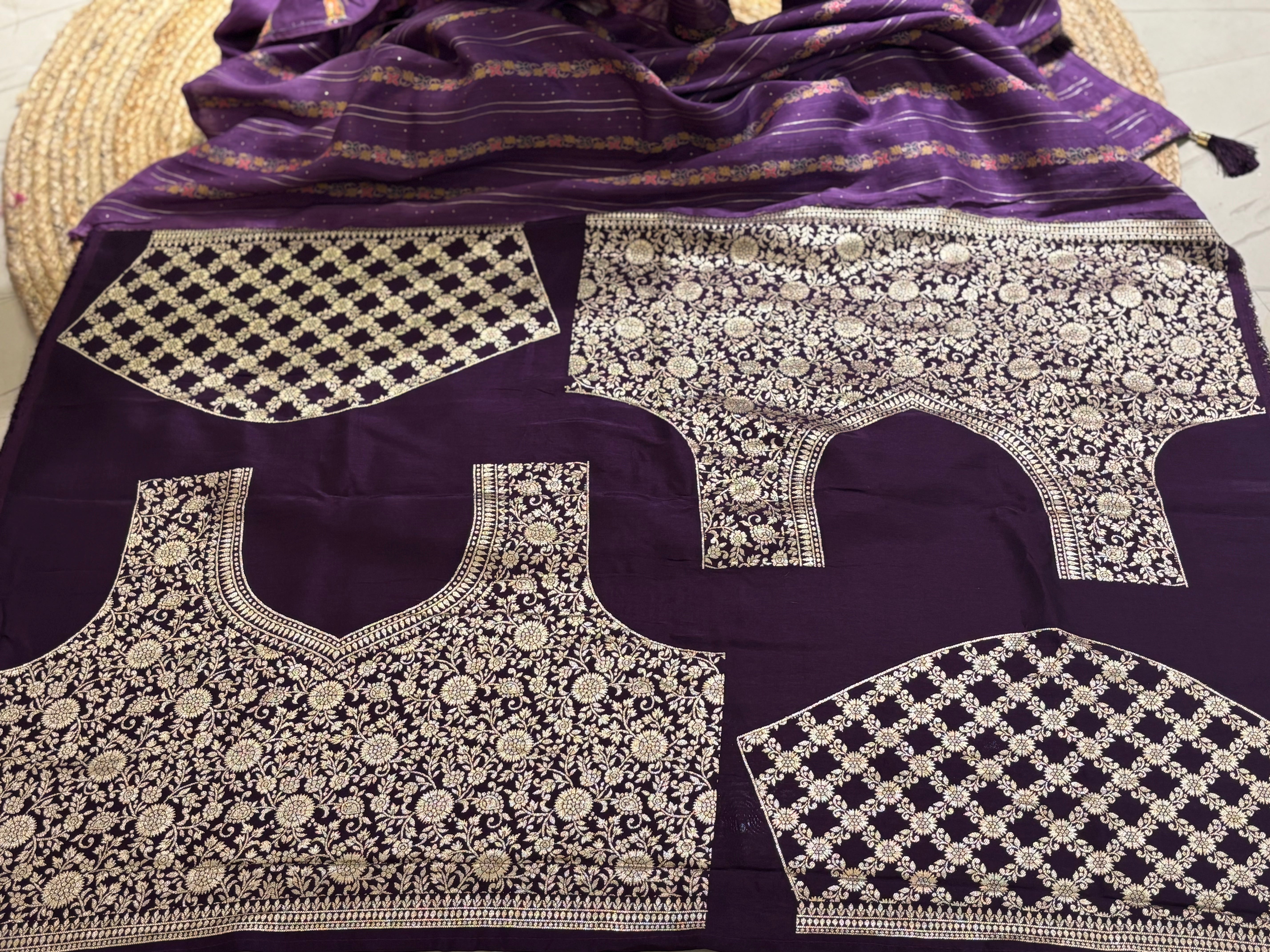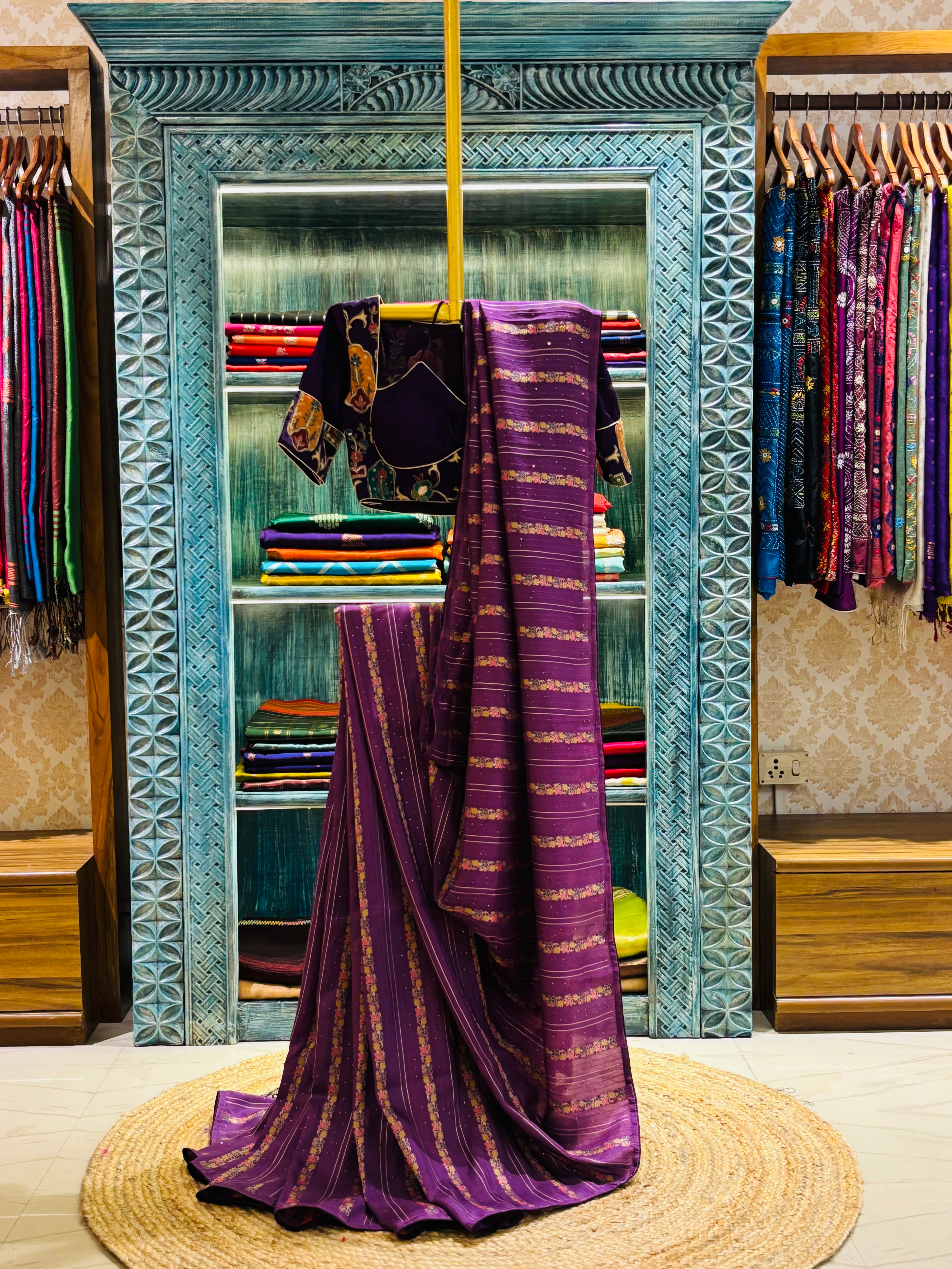 Elevate your elegance with this premium Purple Dola Silk Saree, beautifully adorned with intricate golden motifs that add a touch of timeless charm. Crafted from soft, lightweight, and lustrous Dola Silk, this saree drapes effortlessly, giving you a graceful and sophisticated look for any occasion.