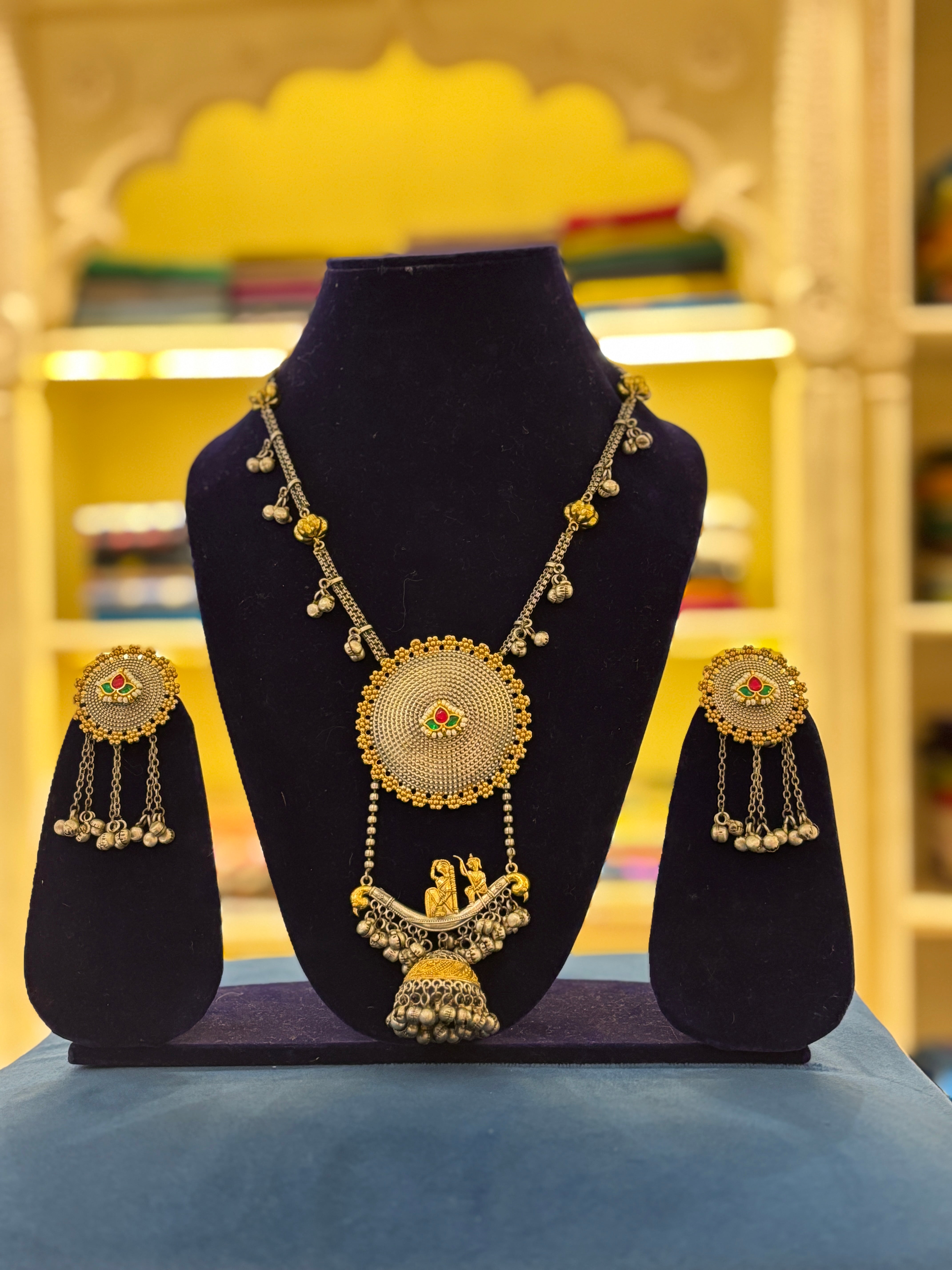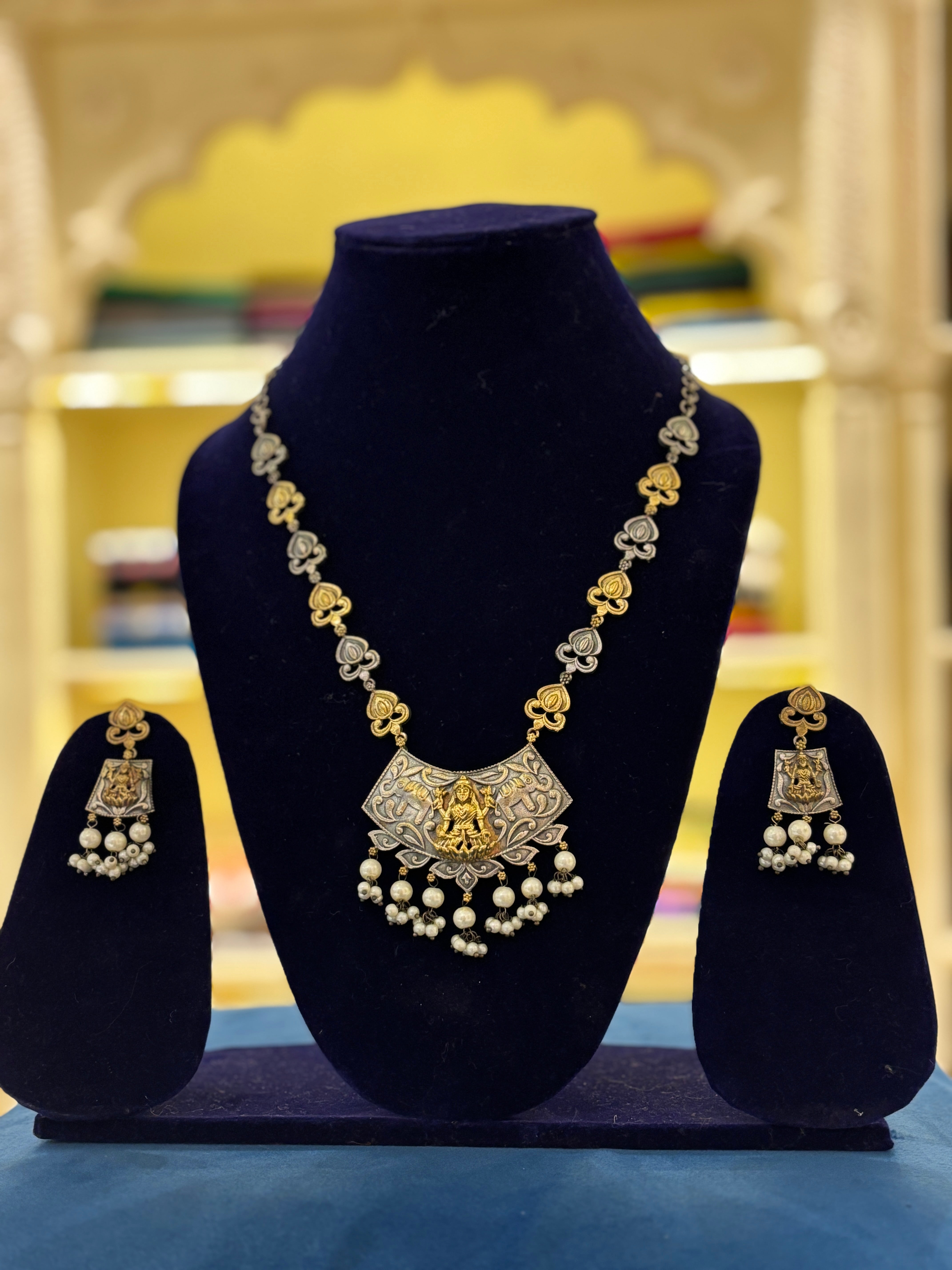 Elevate your jewelry collection with this striking silver replica dual-toned necklace set. Crafted with meticulous attention to detail, the piece combines lustrous silver with complementary metallic tones to create a sophisticated, versatile accessory.